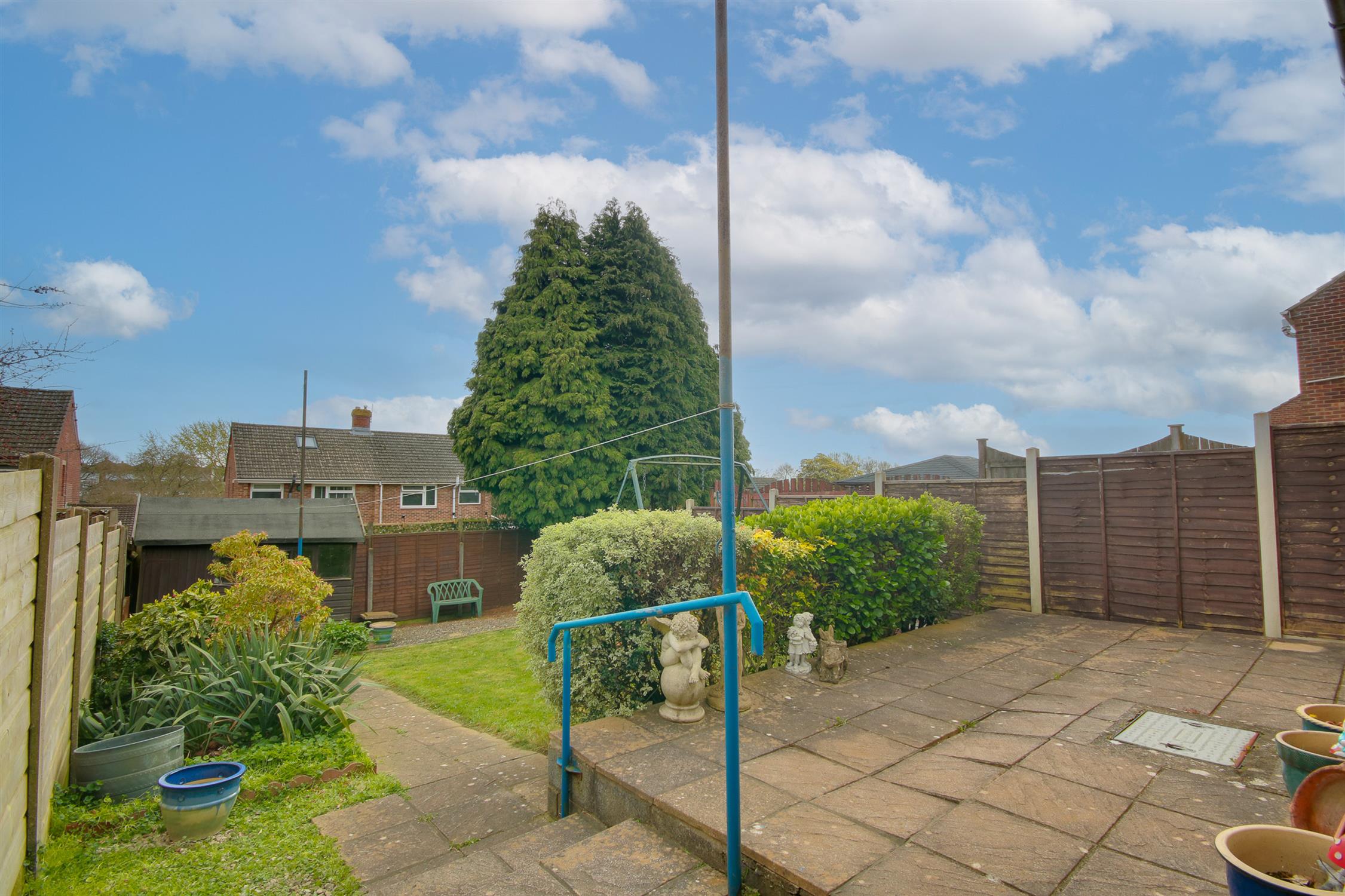 Fence enclosed rear garden, patio seating area, steps down to lawn.
