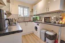 Smooth finish to ceiling, double glazed window to front and side elevation, matching wall base and drawer units with roll top work surface over, stainless steel sink and drainer inset, integrated oven and hob with extractor fan over, space for appliances, tiled splashbacks, large under stairs storage cupboard, radiator.