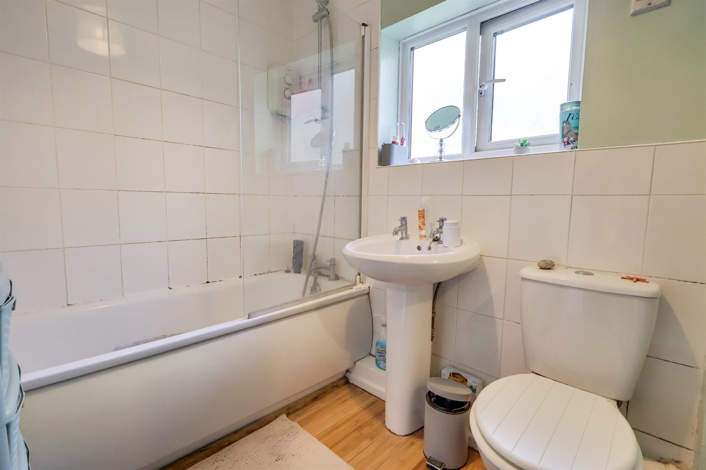 Textured finish to ceiling, double glazed window to front elevation, panel enclosed bath with electric shower over, wash hand basin and low level WC, heated ladder towel rail, laminate flooring.