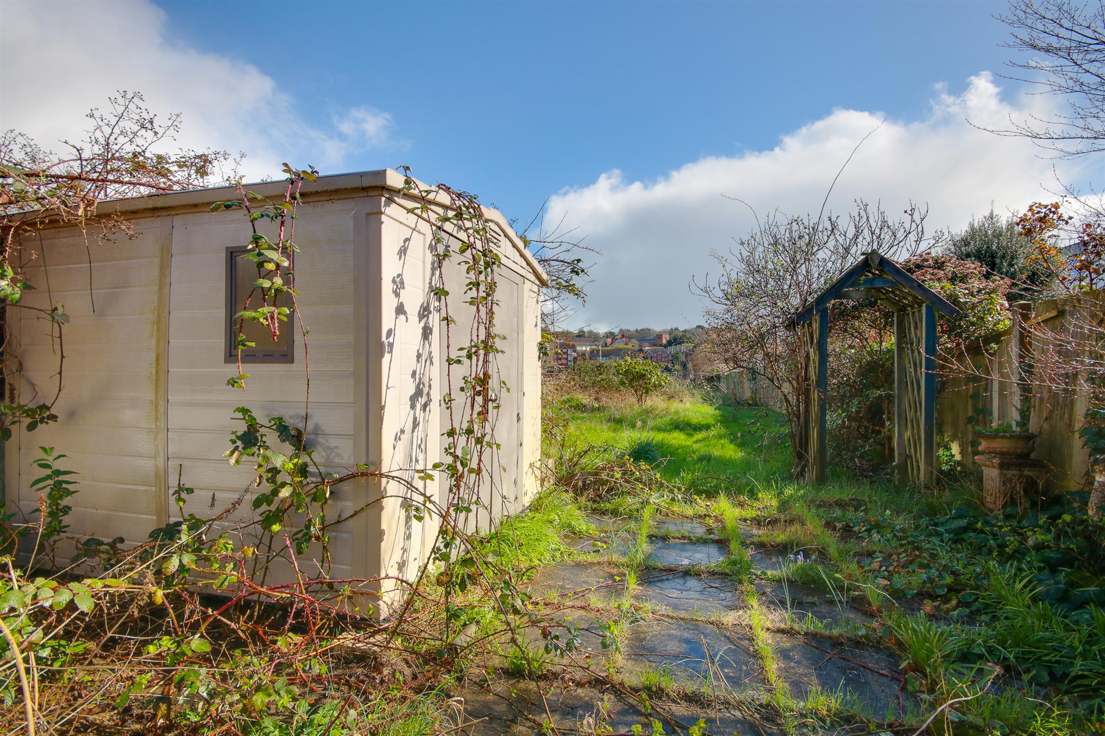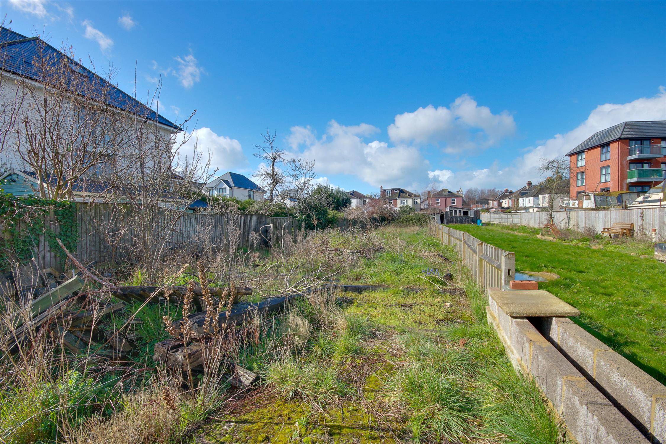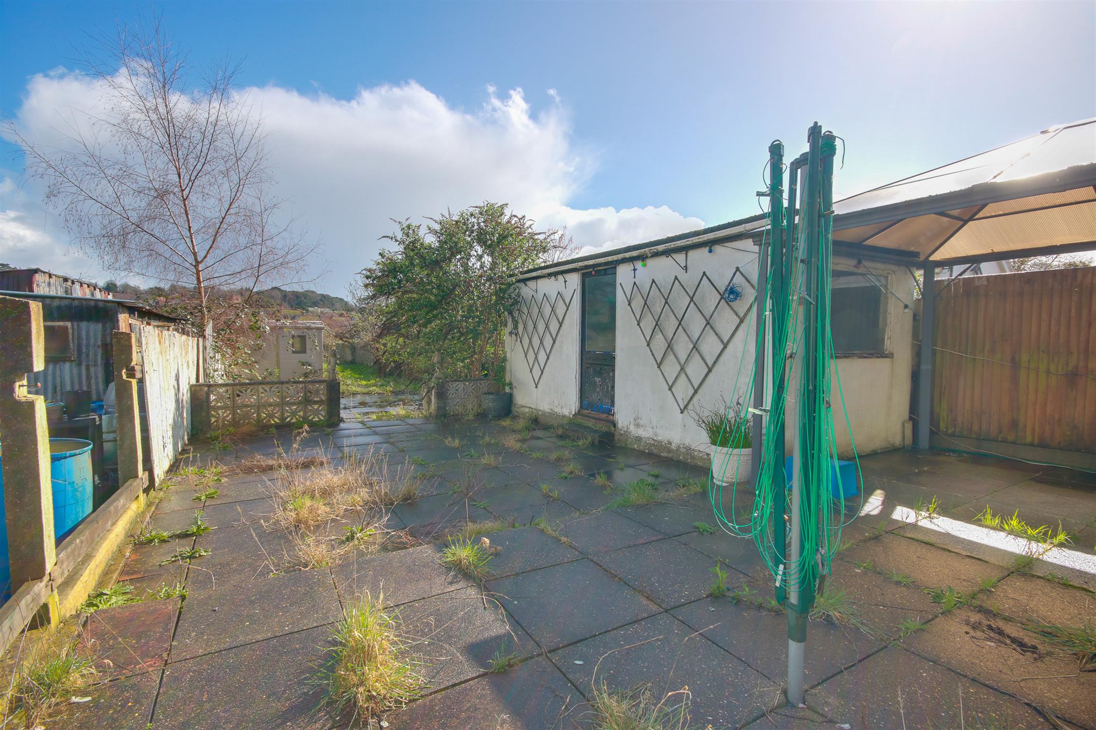 A larger than average rear garden, enclosed fencing, patio seating area leading to an extensive lawn, two sheds, side access with roller door, potential access to mooring. Detached workshop with power and light connected.