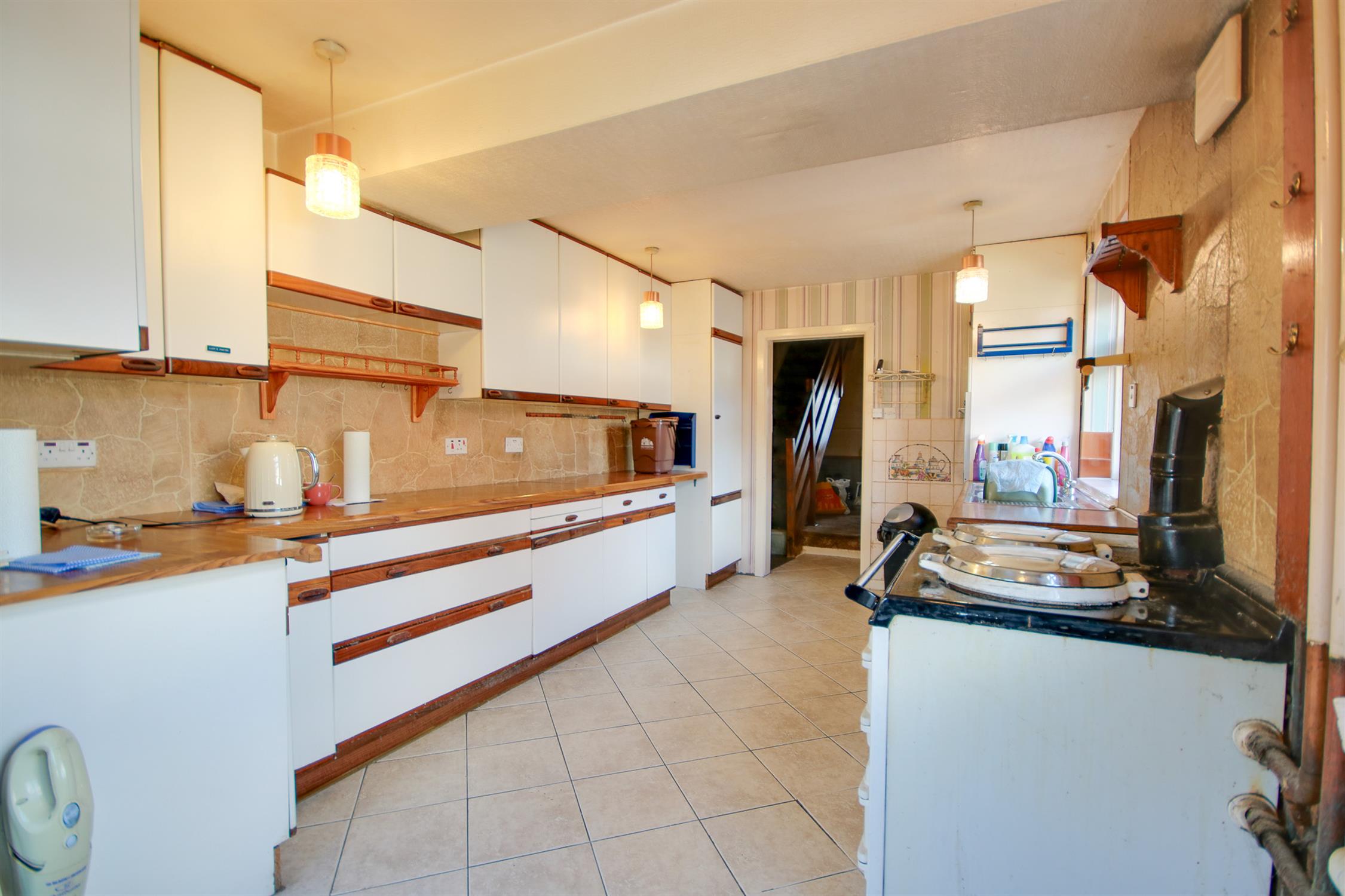 Textured ceiling, two UPVC double glazed windows to side, UPVC door leading into garden, wall and base units with work surface over, stainless steel sink and drainer inset, aga, integral oven, space for washing machine and fridge/freezer, wall and floor tiles.