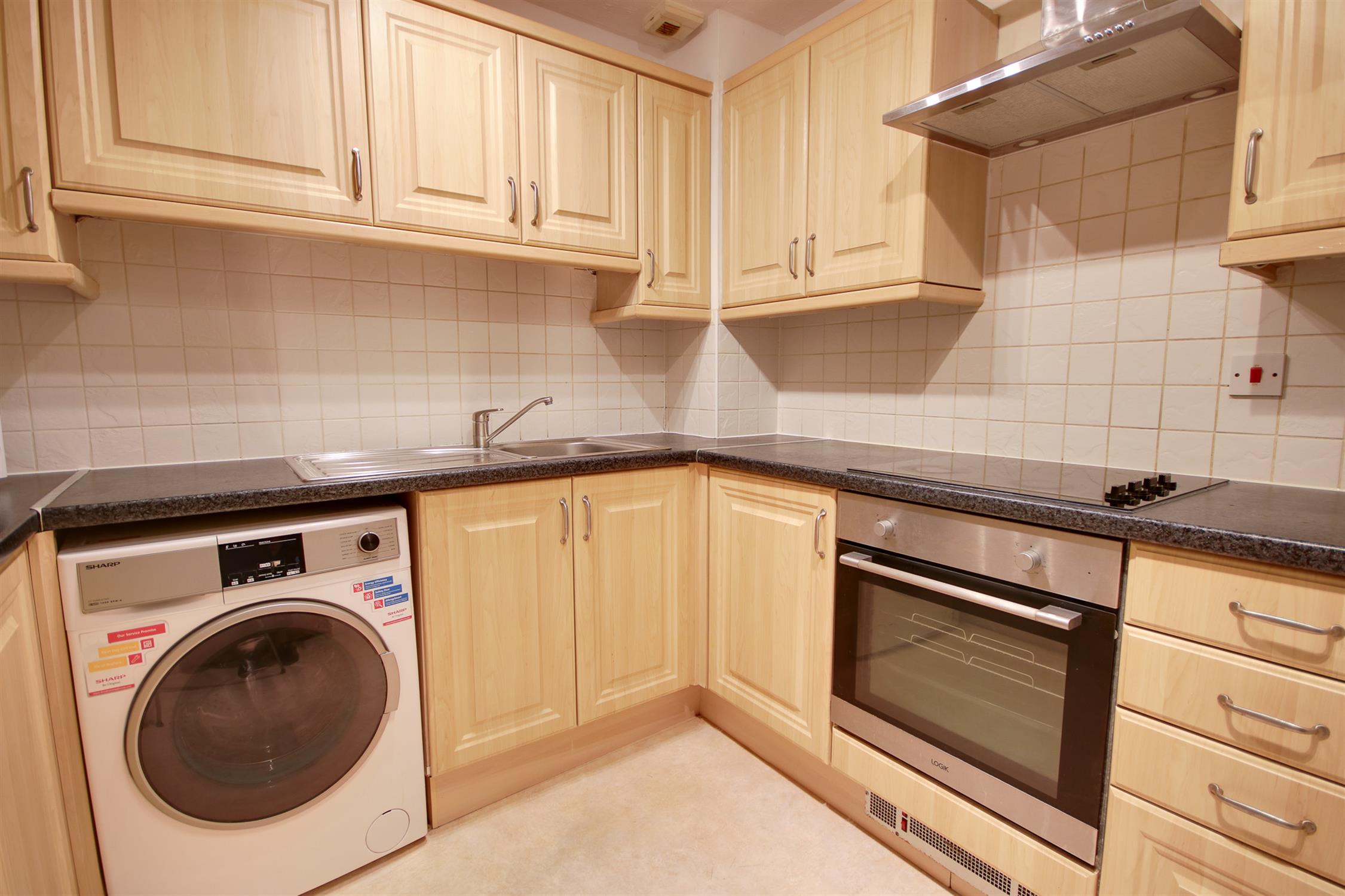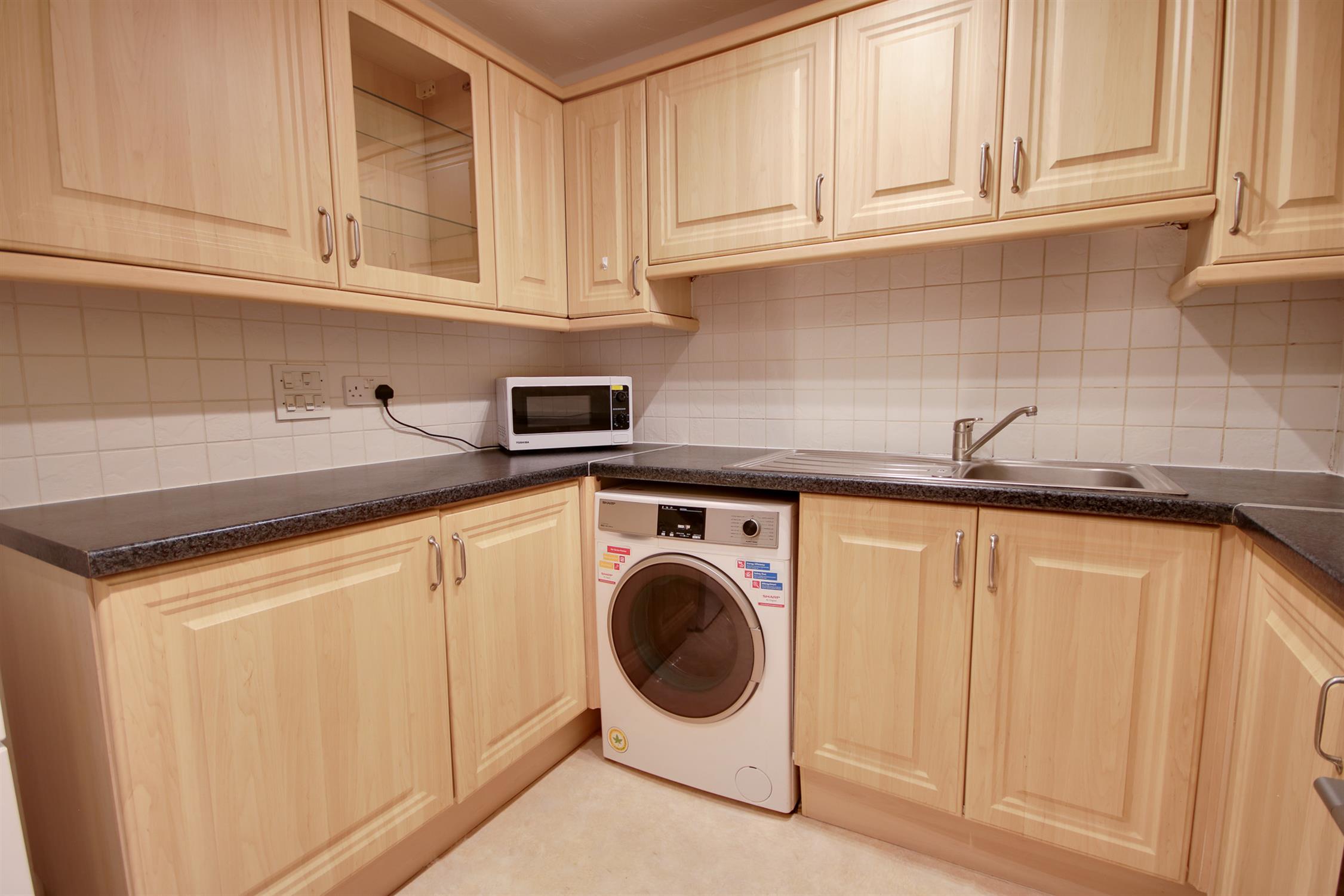 Textured ceiling, a range of wall, base and drawer units with work surface over, sink and drainer inset, built in oven and hob with extractor fan over, space for fridge/freezer and washing machine.