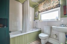 Smooth ceiling, double glazed obscured window to front, three-piece suite comprising: panel enclosed bath, WC, wash hand basin, ladder towel rail.