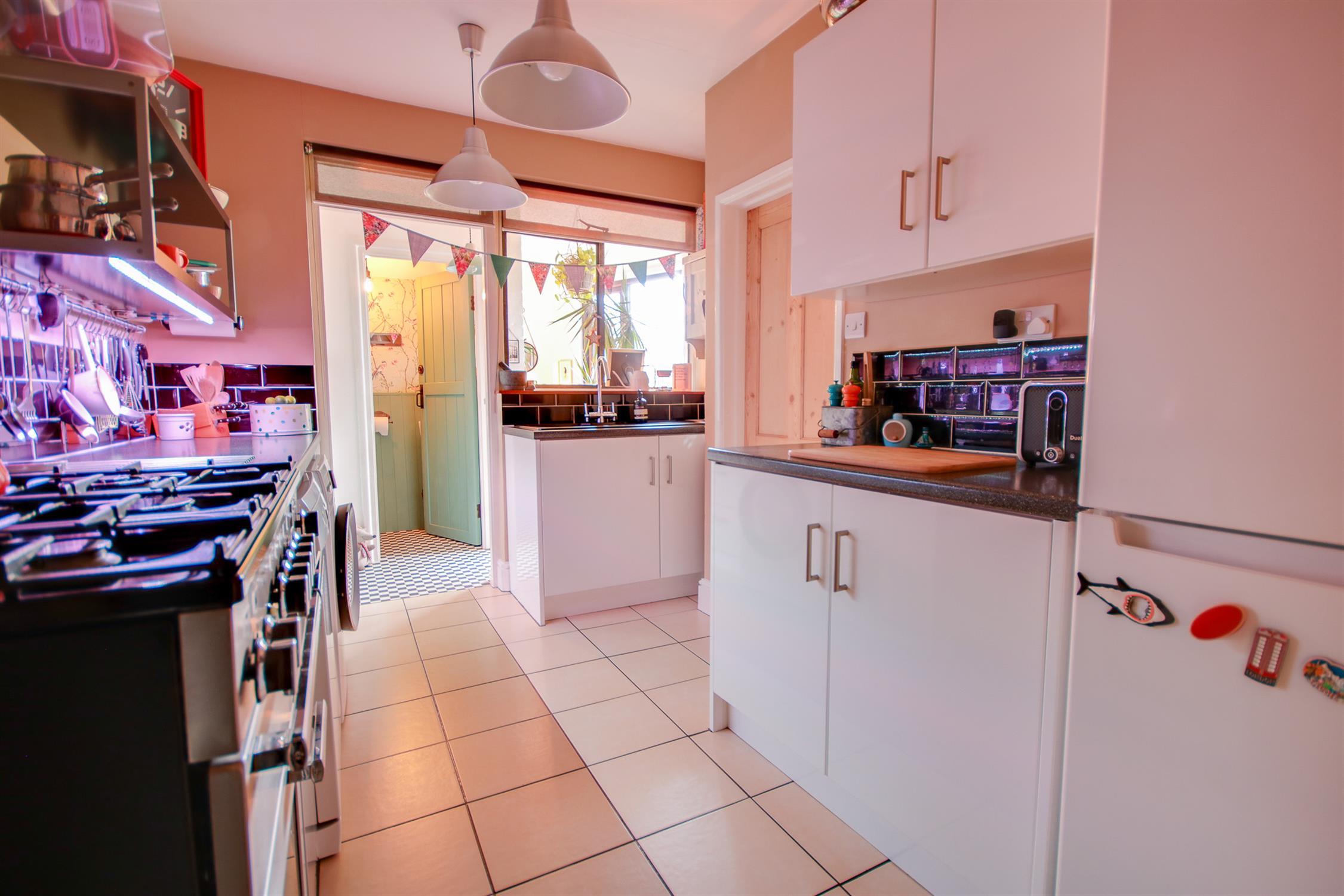Smooth ceiling, double glazed French doors to rear, storage cupboard, radiator, door to: