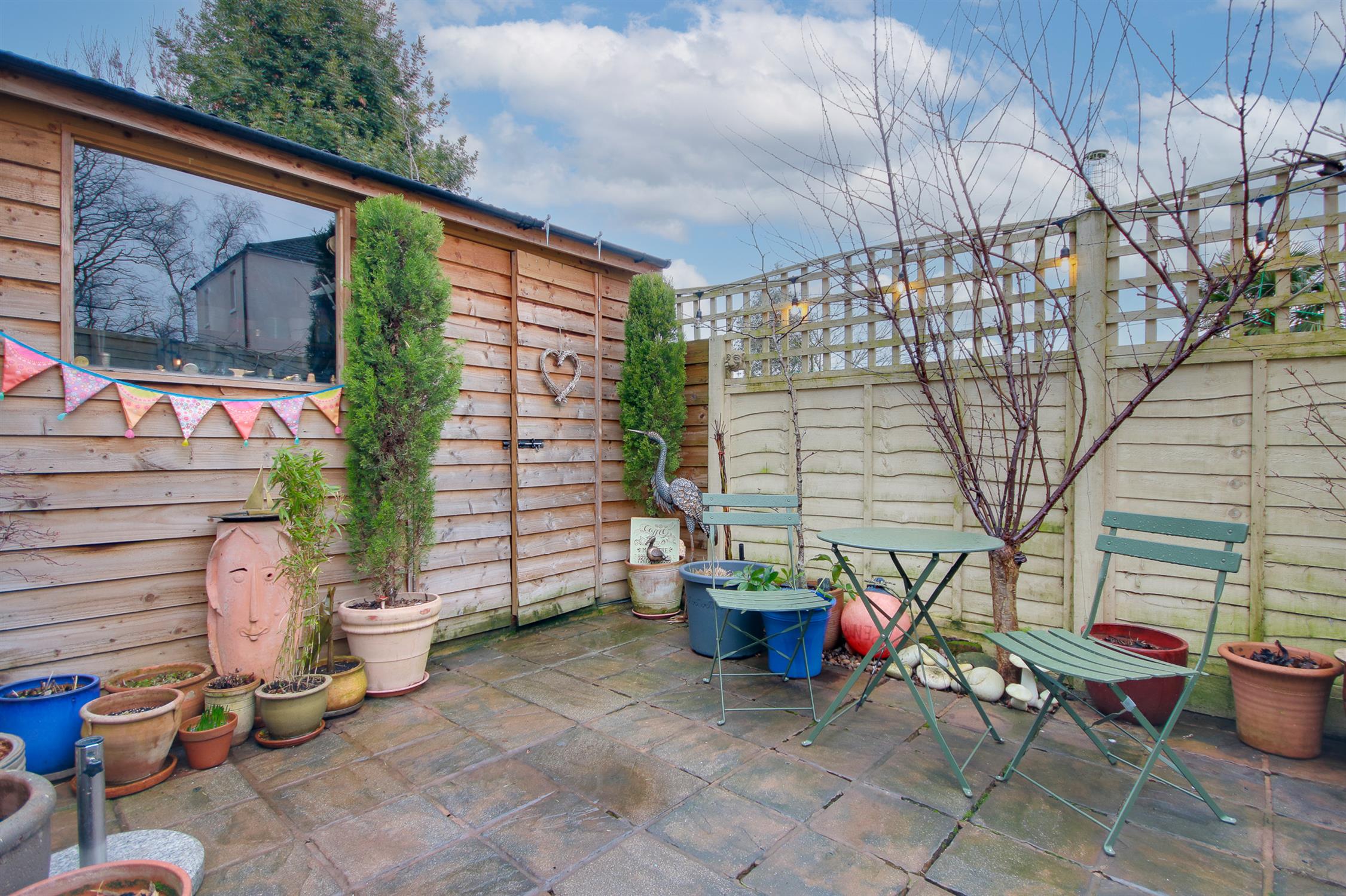 Fence enclosed garden, storage shed, rear pedestrian access.
