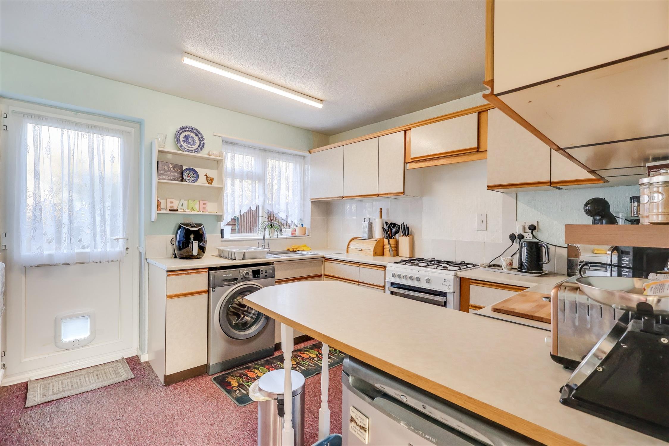 Textured finish to ceiling, double glazed window & door to rear elevation. A range of matching wall, base and drawer units with roll top work surface over, breakfast bar, inset sink & drainer, tiled splashbacks, space for white goods, radiator.