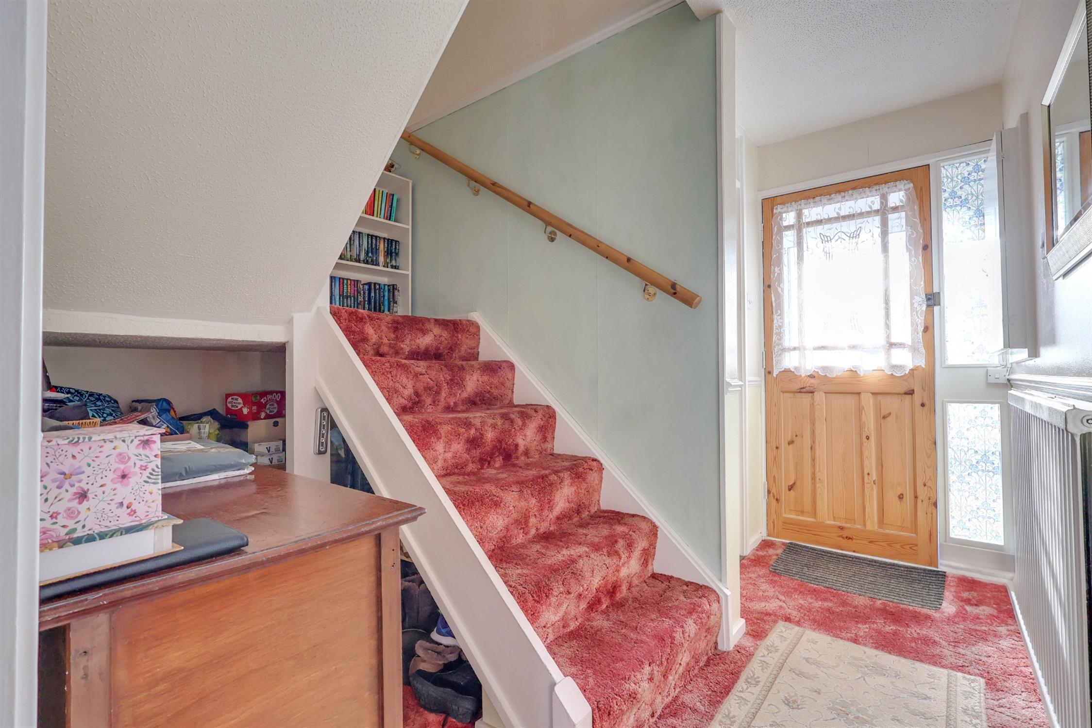 Textured finish to ceiling, door to front elevation, radiator, stairs rising to first floor, doors too.