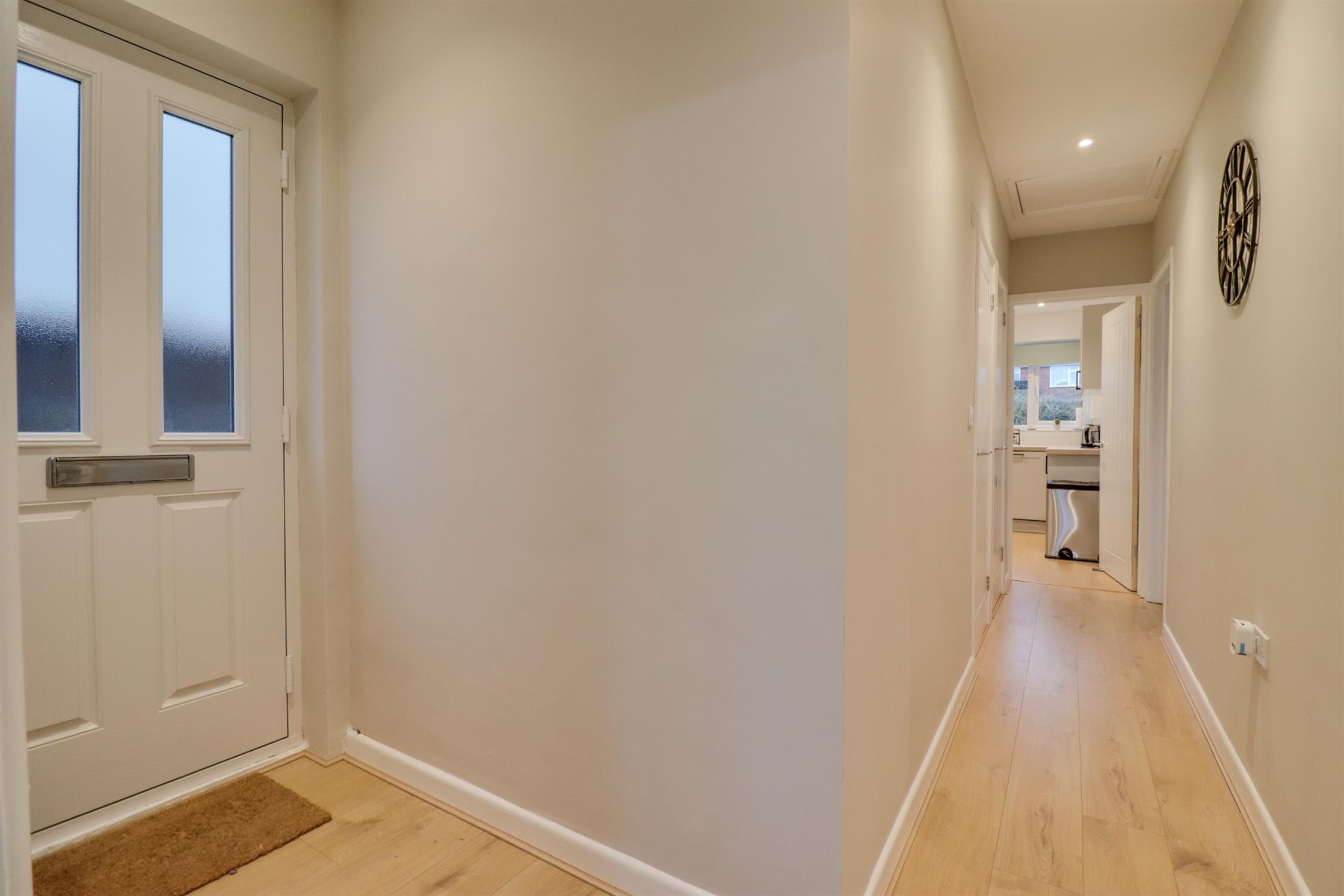 Smooth finish to ceiling with inset spotlights, double glazed window to rear elevation, range of matching shaker style wall base and drawer units with roll top work surface over, one and half bowl stainless steel sink and drainer inset, integrated fridge freezer, dishwasher, oven and hob with extractor fan over, tiled splashbacks, radiator, laminate flooring.
