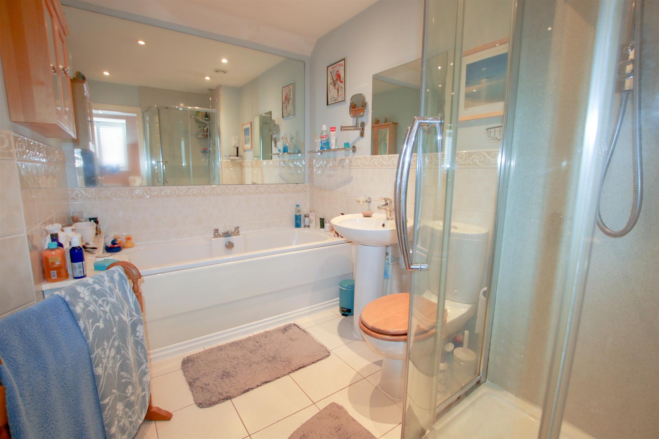 White suite comprising, Jacuzzi bath, pedestal wash hand basin, low level WC, separate enclosed shower cubicle, heated rails, tiled splash back, extractor fan, smooth finish to ceiling and spotlights.