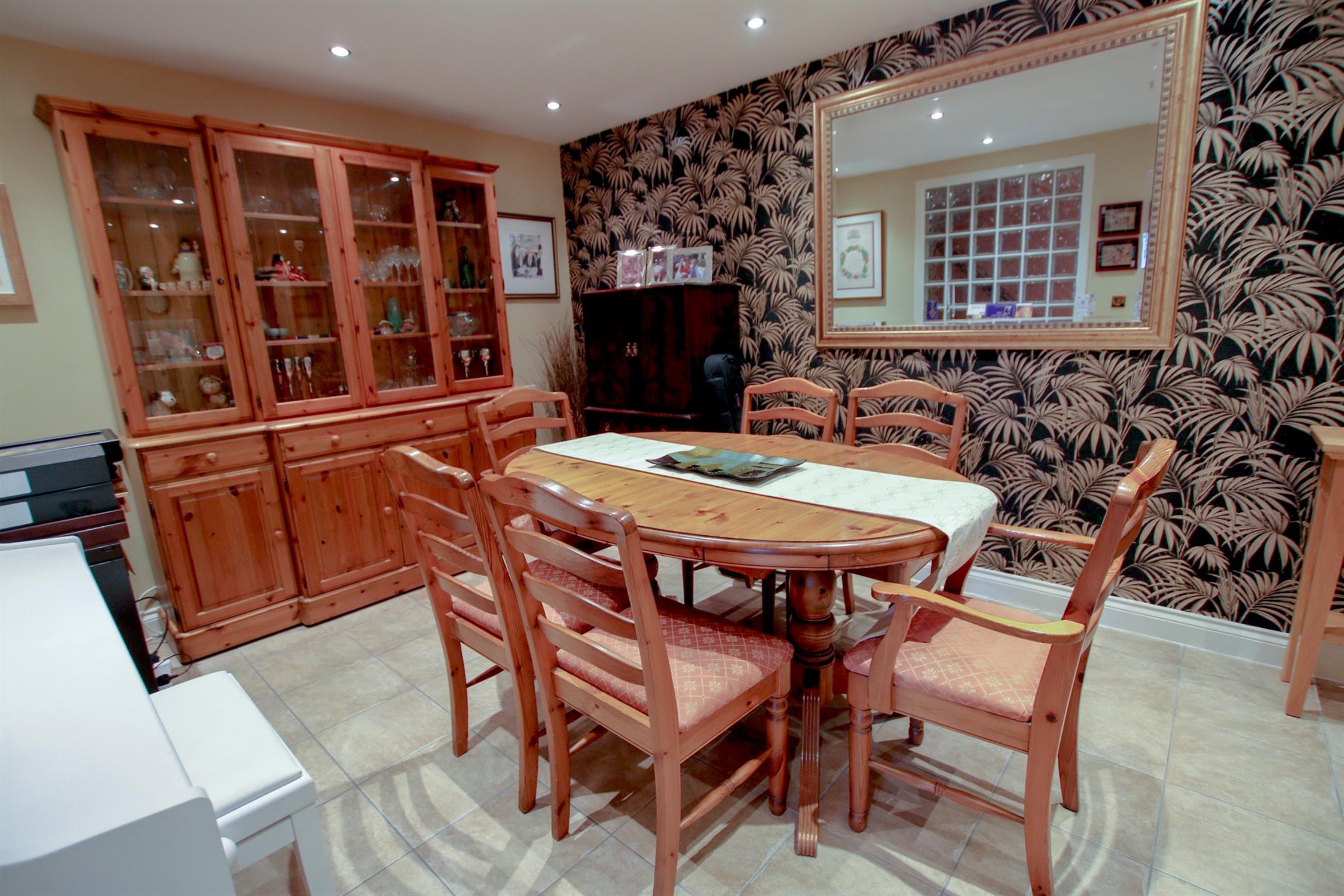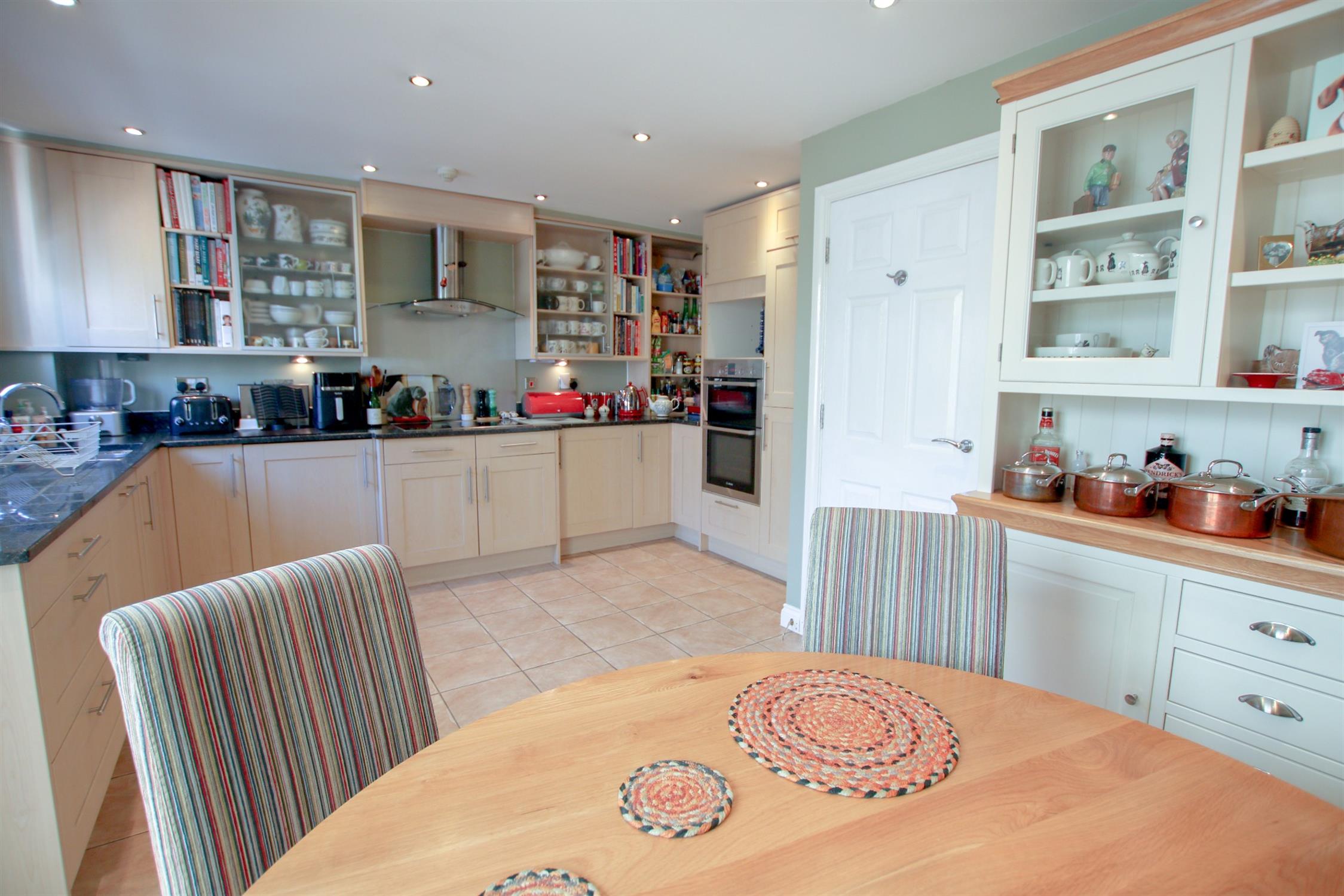 Range of fitted units base and eye levels, granite work surface with inset sink unit, built in double oven plus ceramic hob, built in dishwasher and fridge/freezer, washing machine, radiator, spotlights, dining area, smooth finish to ceiling, double glazed window to rear elevation and french doors to conservatory.