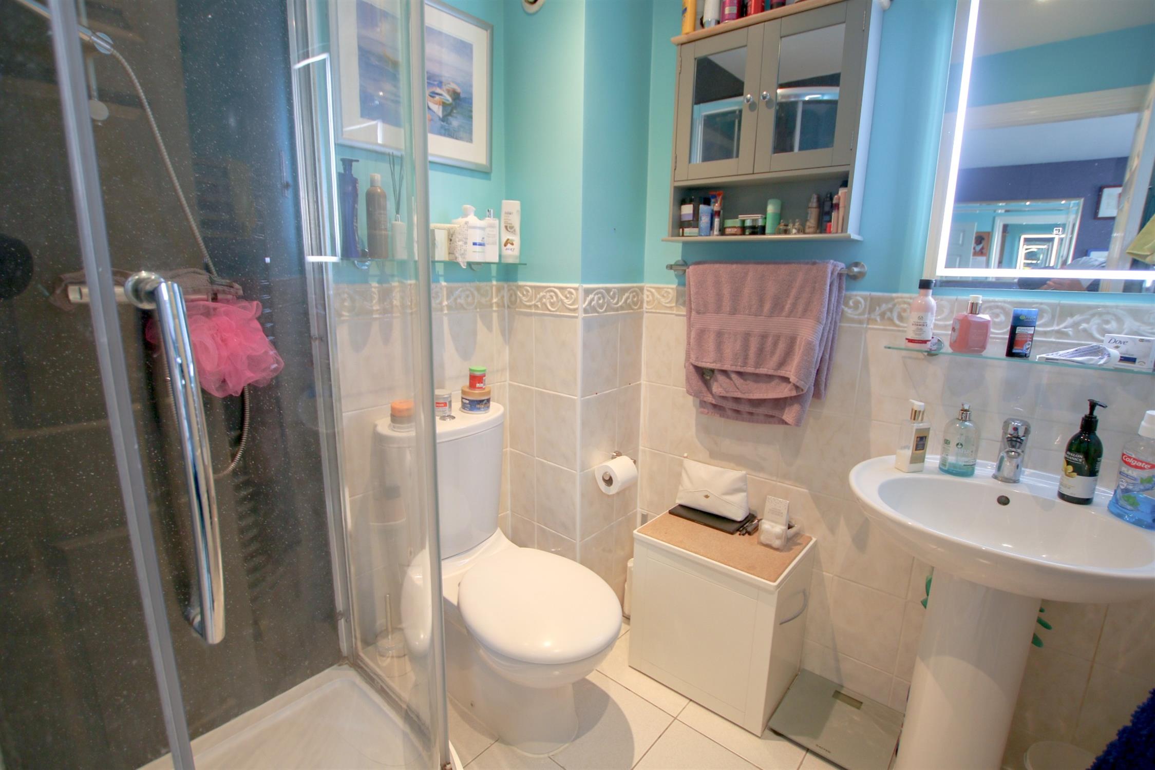 Enclosed shower cubicle, low level WC, pedestal wash hand basin, heated rail, tiled splash backs, smooth finish to ceiling spotlights and extractor fan.