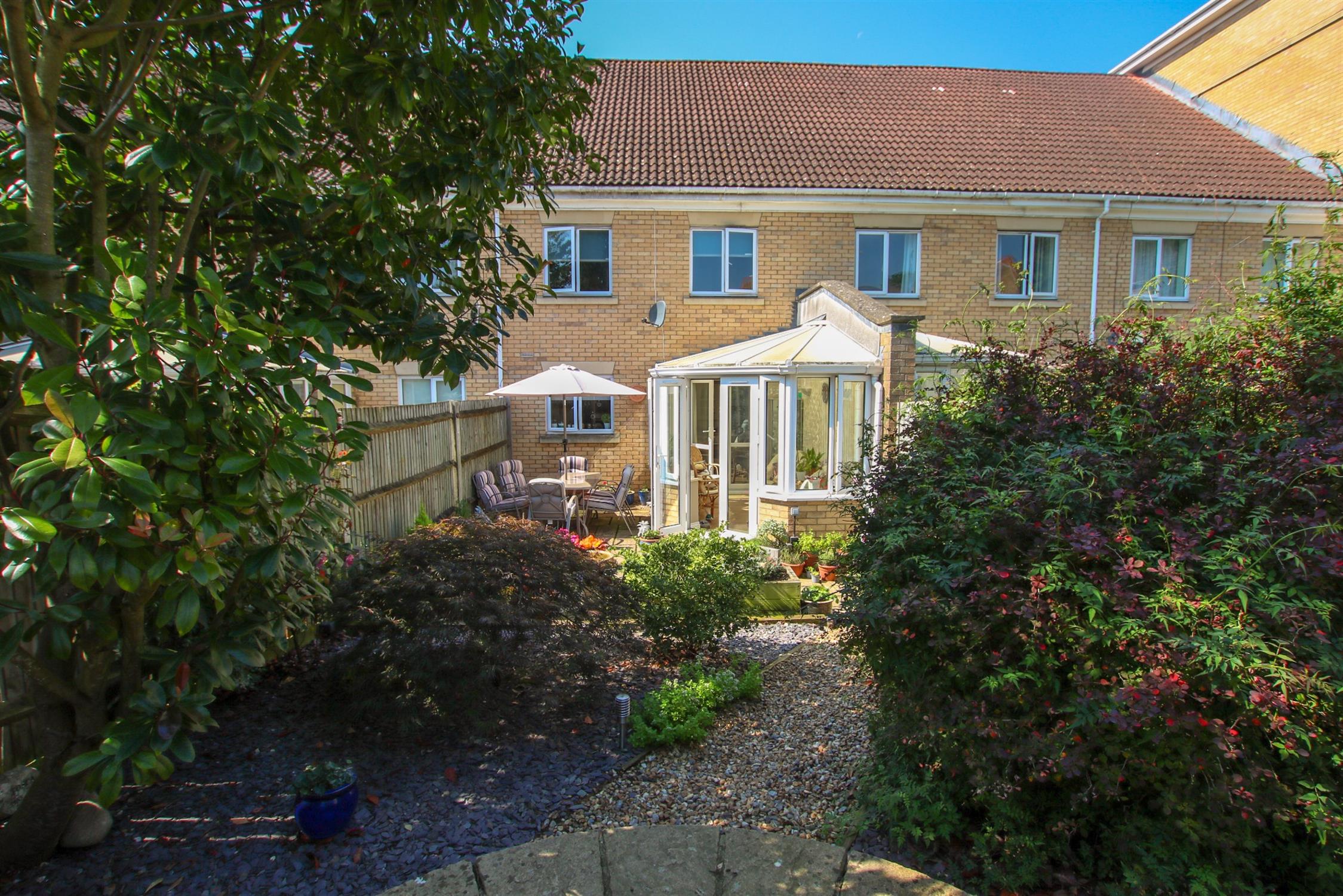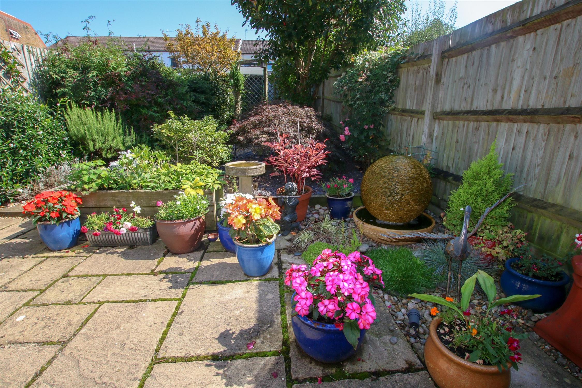 Attractive enclosed rear garden with paved patio areas, shingled with flower beds with various plants and flowers.