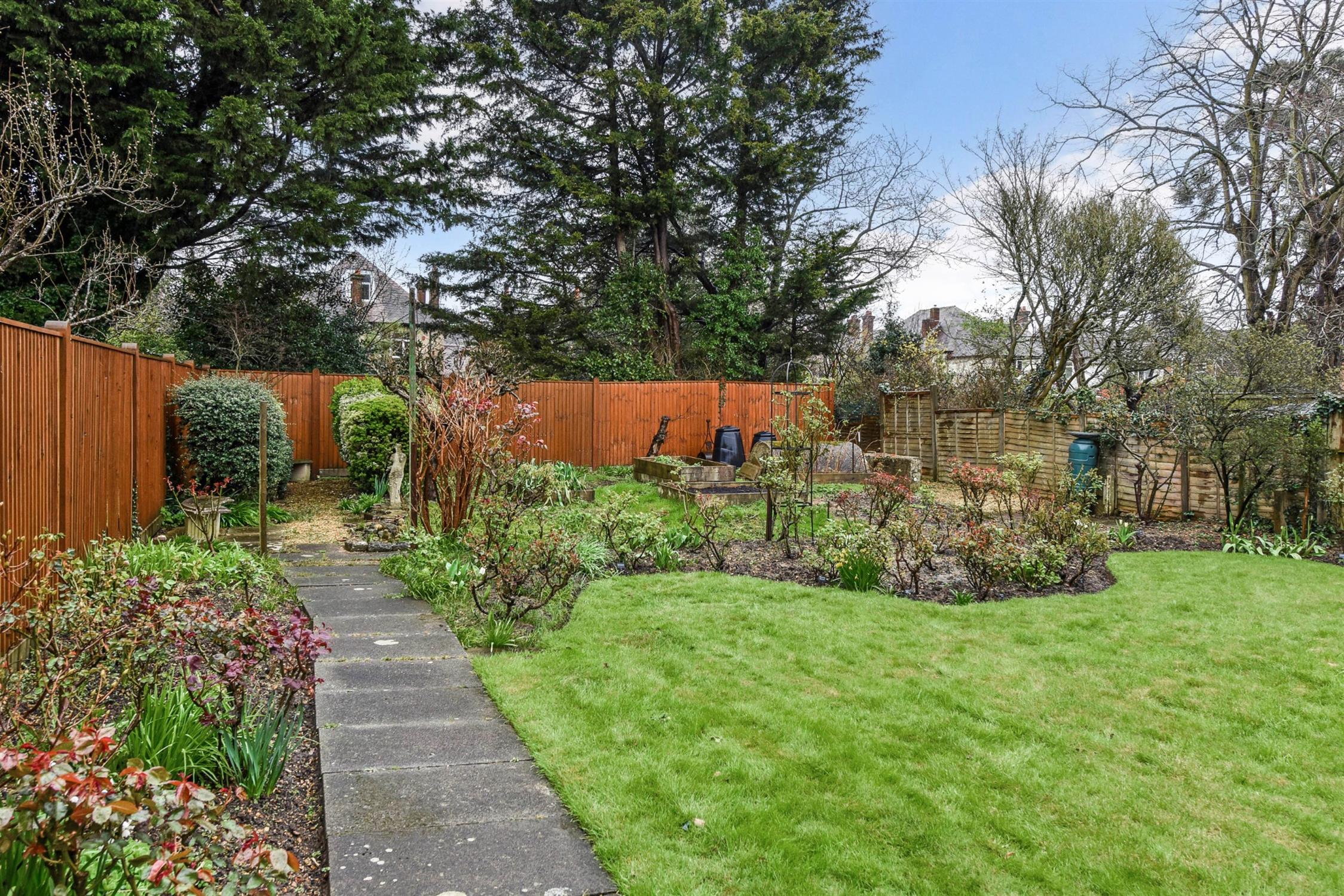 Large well stocked rear garden with raised patio area, well established rose garden, steps to lawns and well stocked flower and shrub borders, enclosed by fencing, detached garage.