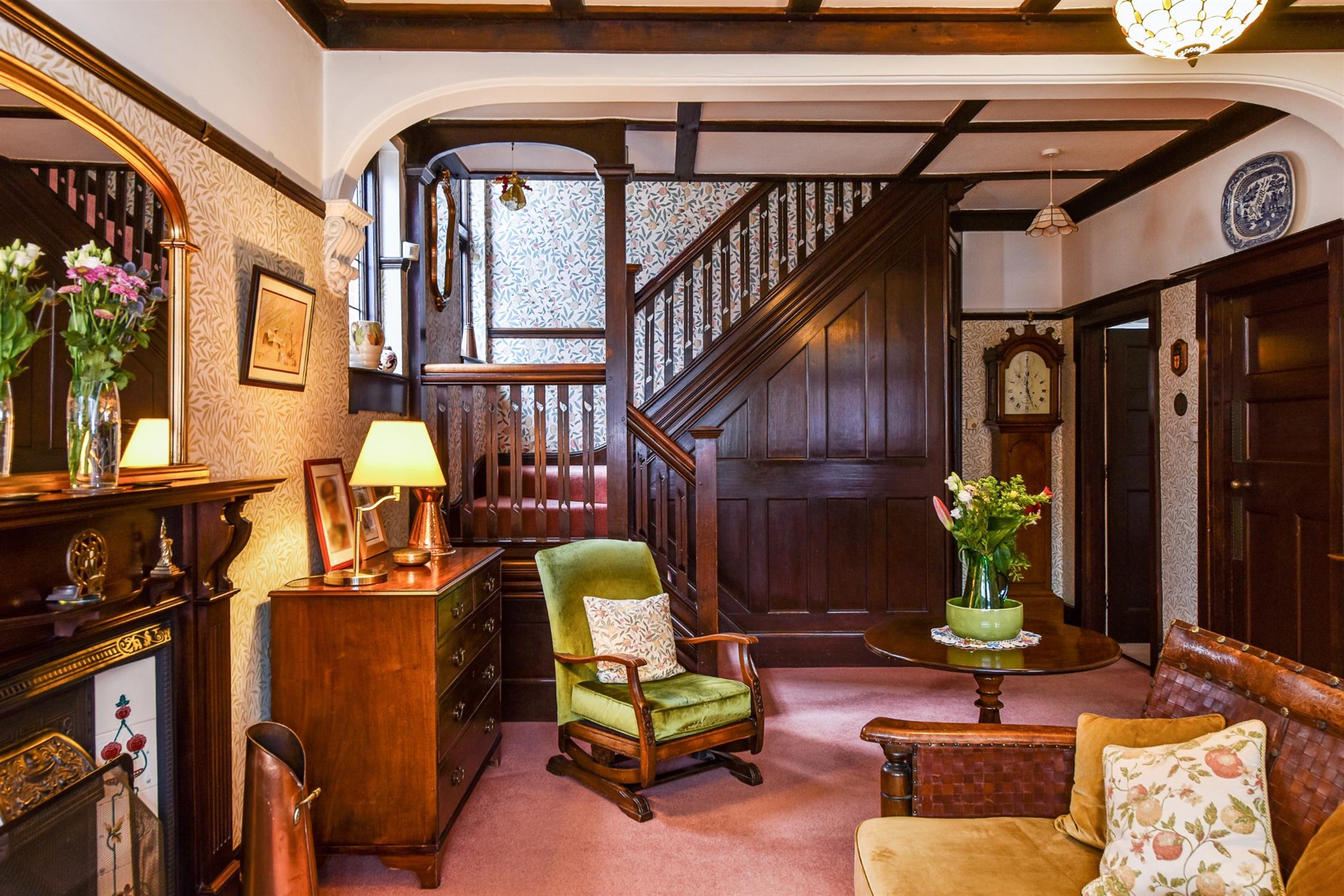 Feature fireplace, picture rail, radiator, under stairs cupboard, attractive panelling, double-glazed window to side elevation, feature staircase and original doors to: