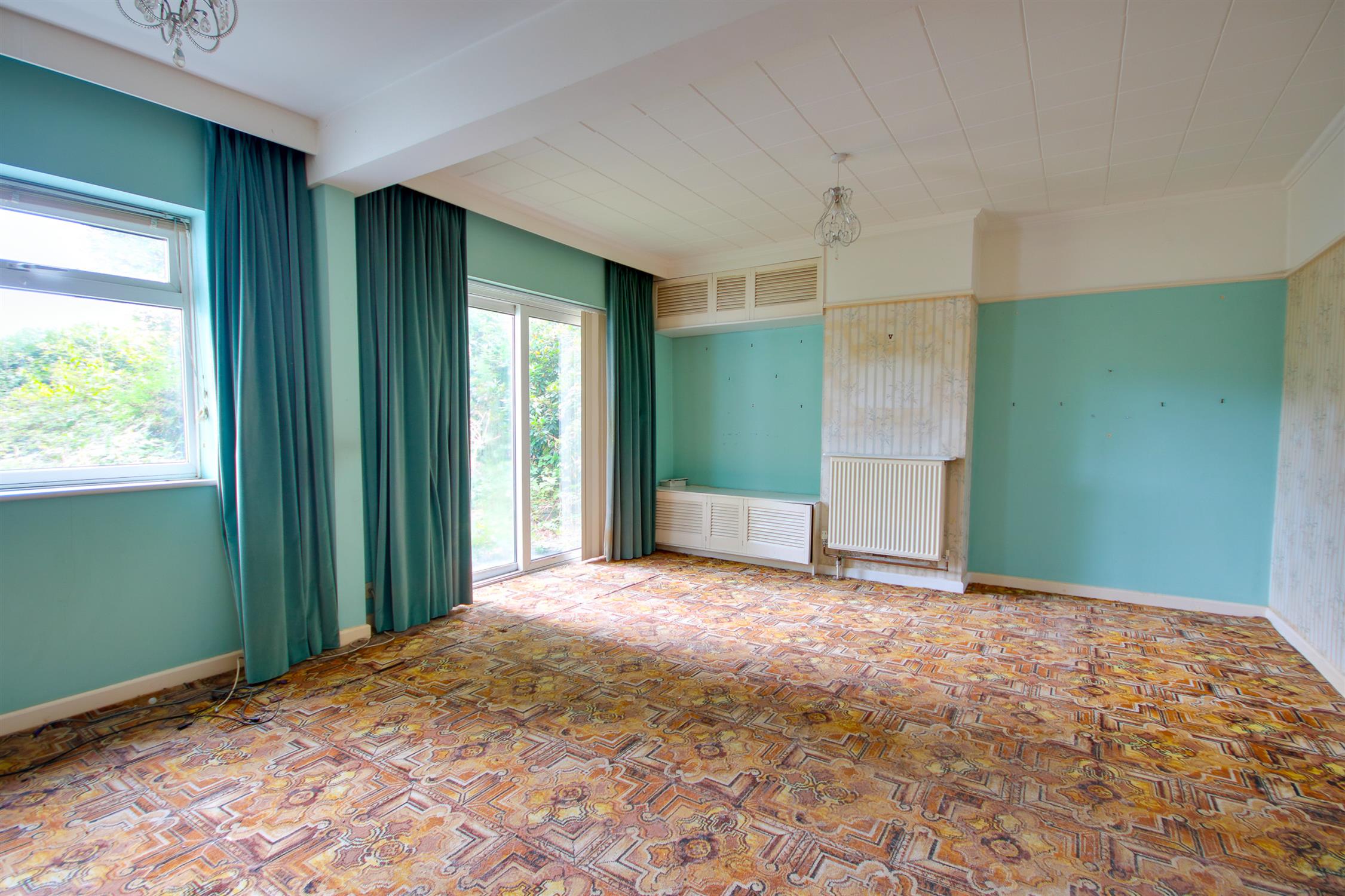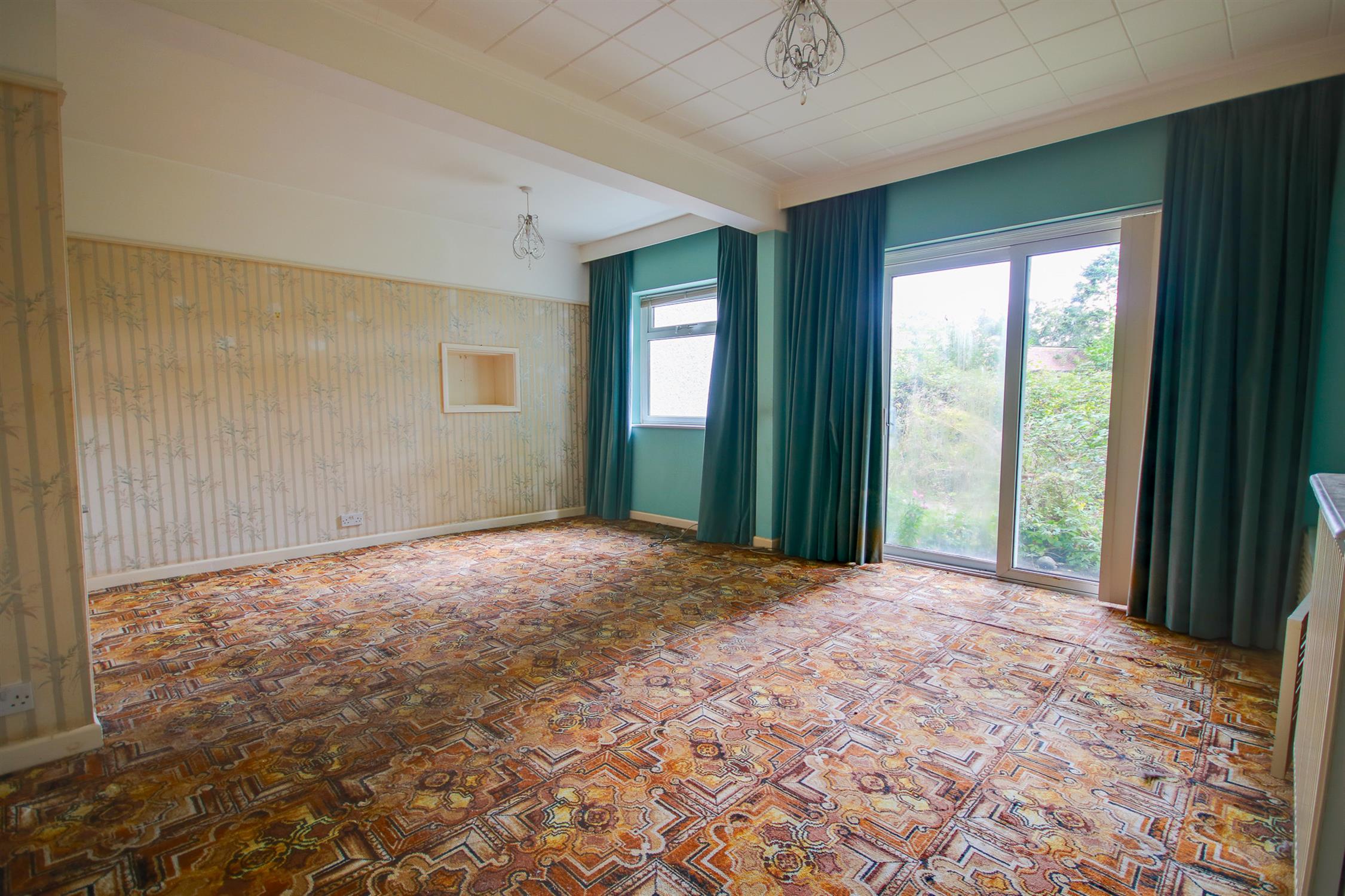 UPVC double glazed sliding doors and window to side, serving hatch, radiator.