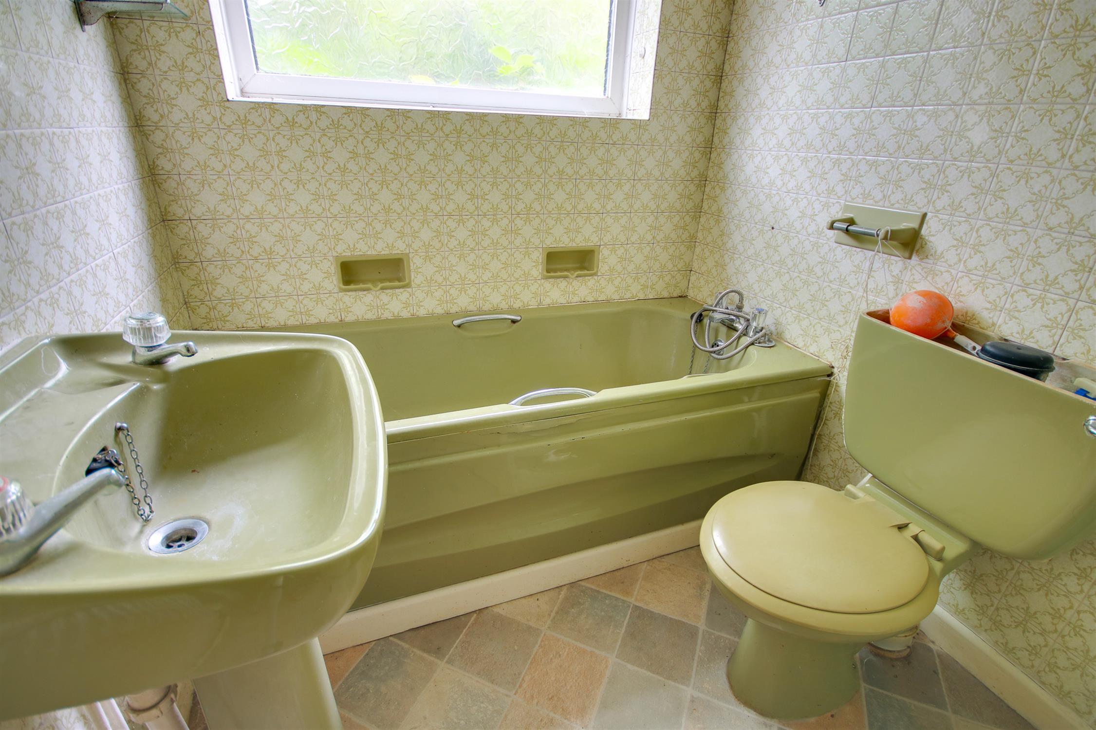 Textured ceiling, UPVC double glazed obscured window to rear, four piece avocado suite comprising WC, wash hand basin, panelled bath and shower cubicle, radiator.