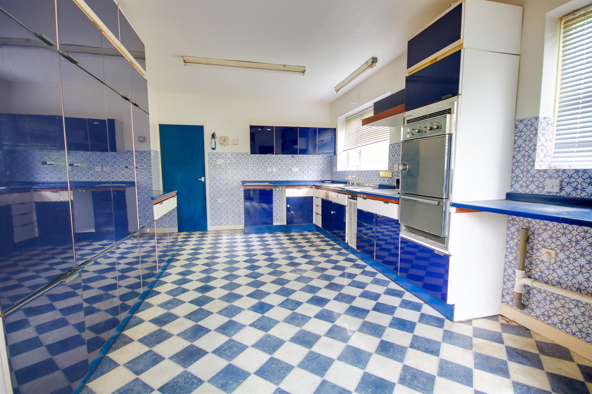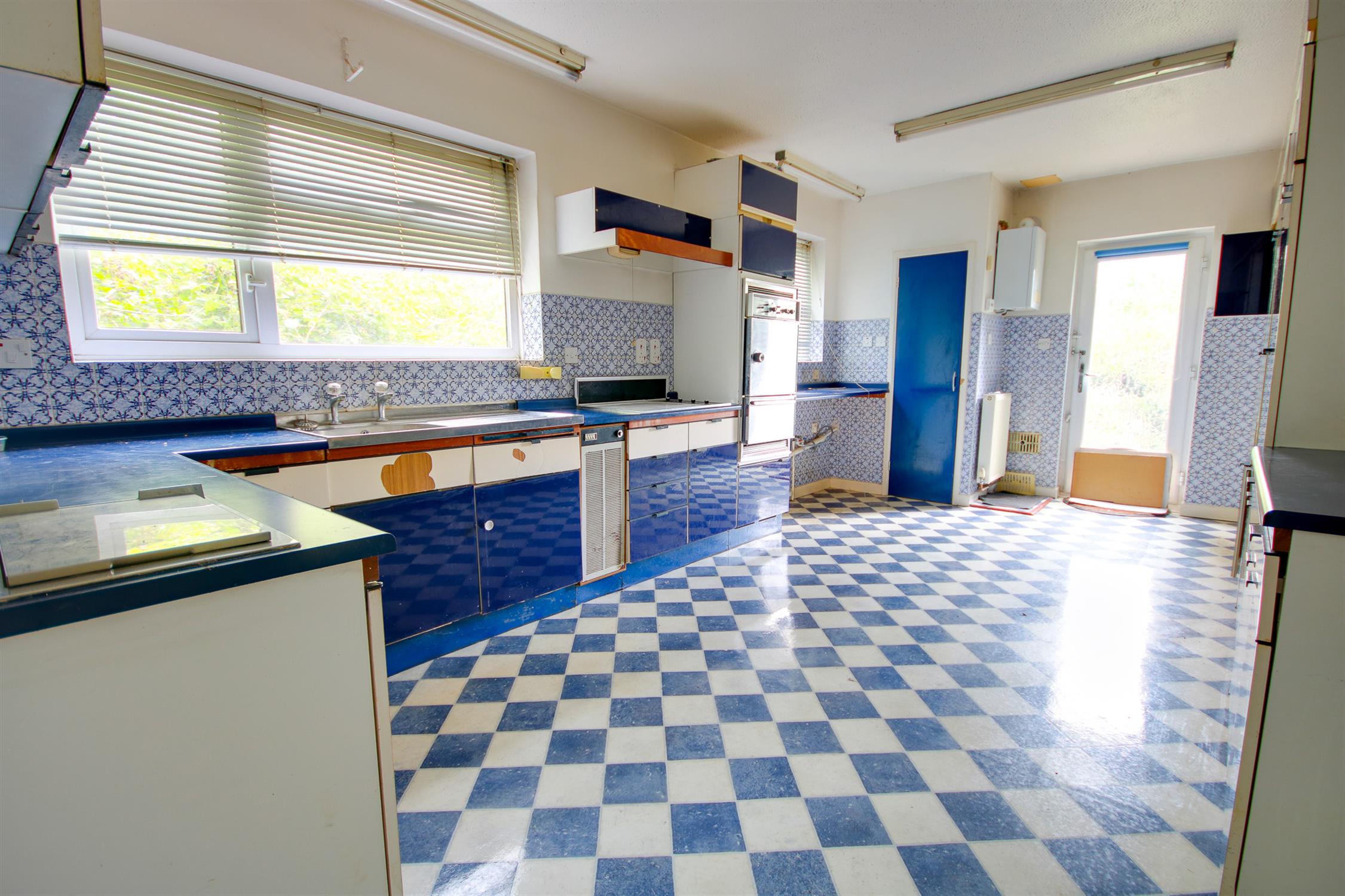 Textured ceiling, two UPVC double glazed windows to rear, UPVC double glazed door to side, retro-style kitchen, wall, base and drawer units with work surface over, stainless steel sink and drainer inset, built in oven and hob, space for further appliances, tiled splashbacks, radiator, wall-mounted gas boiler, A/C.