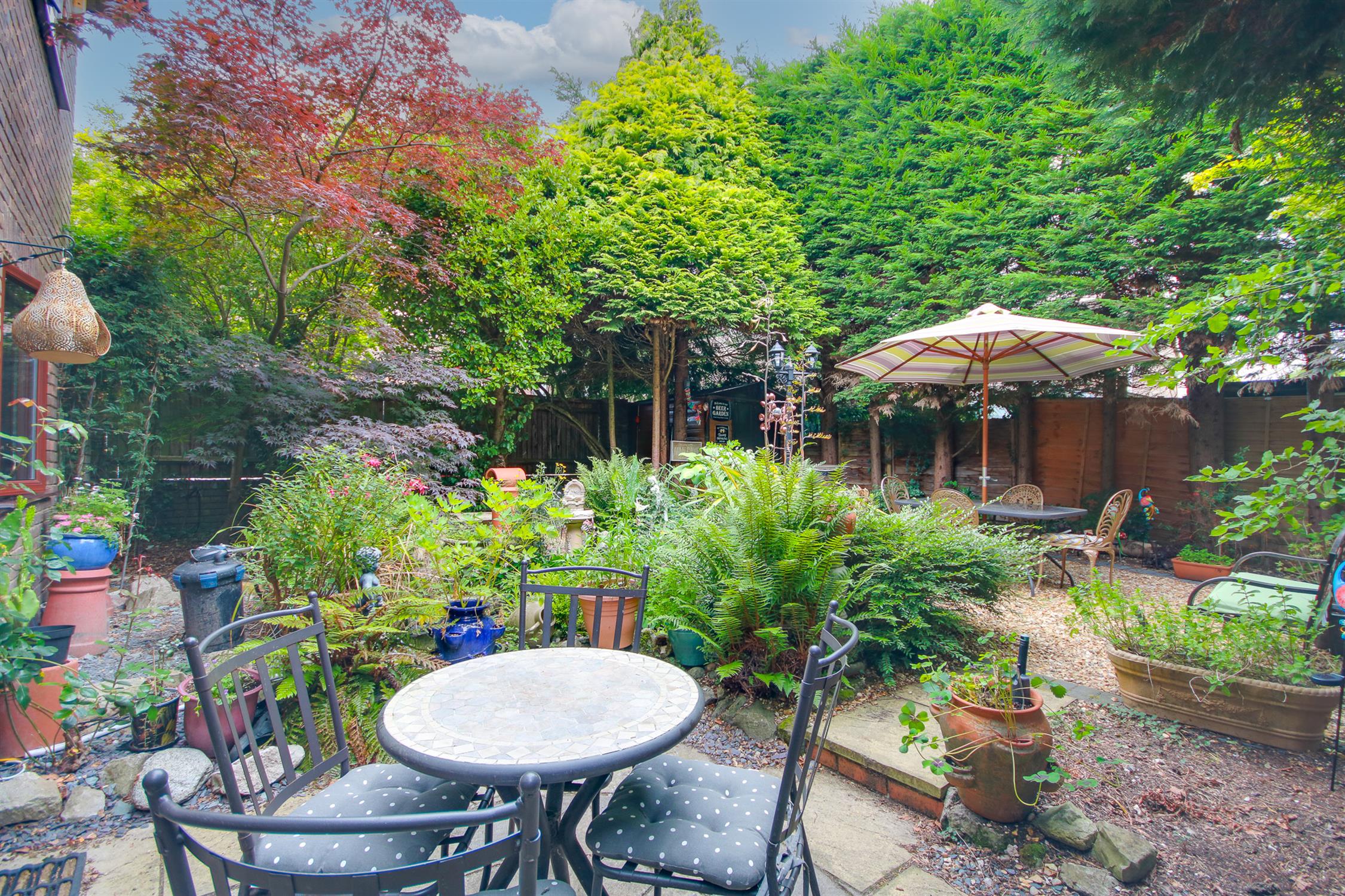 Fence enclosed rear garden, patio area leading to shingle seating area, bar.