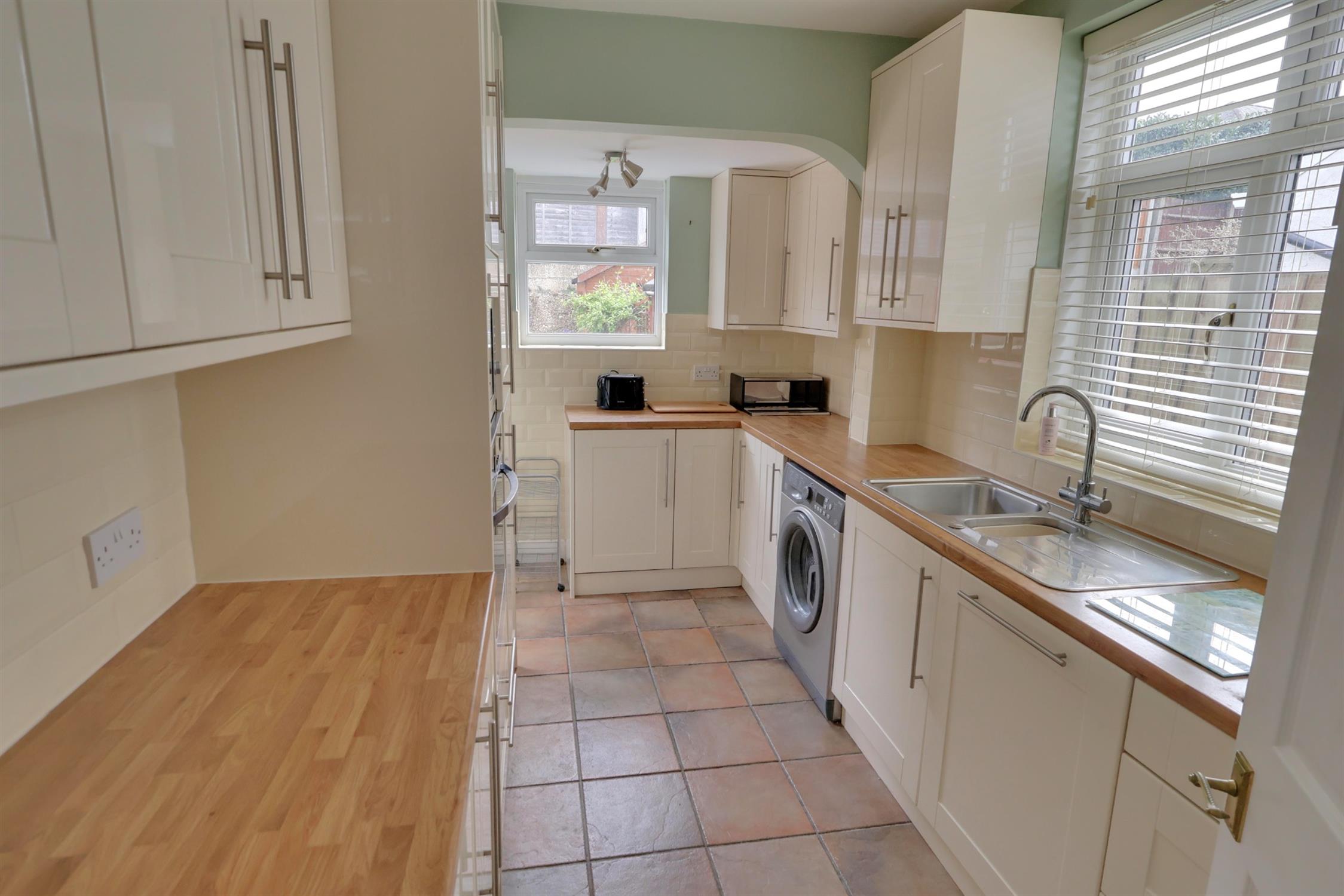 To the rear of the property sits a well-proportioned kitchen, offering ample worktop space and plentiful cupboards, along with room for all essential appliances. A back door grants you access to the rear garden.