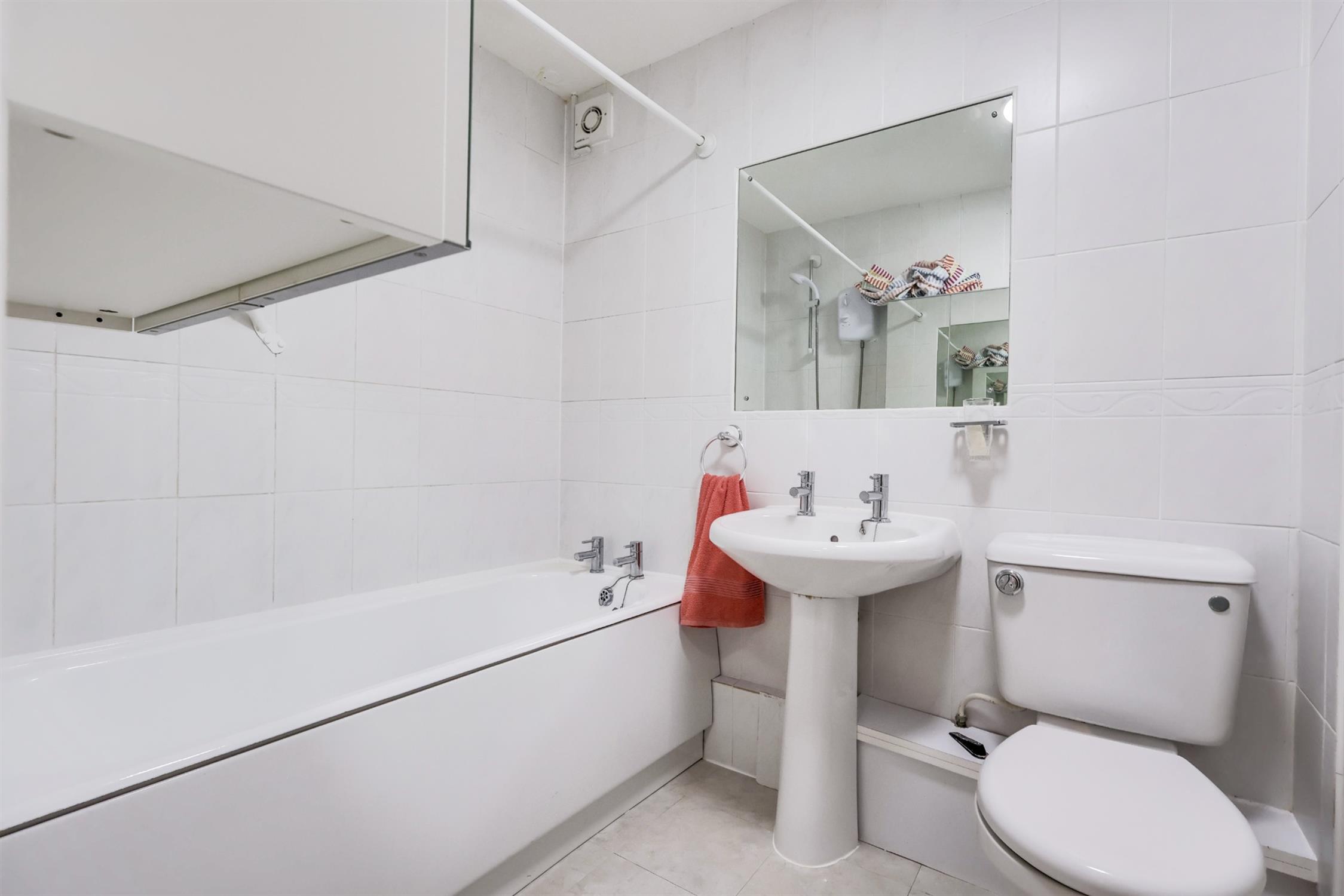 Smooth finish to ceiling, three piece white suite comprising low level WC, wash hand basin and panel enclosed bath, tiled walls, radiator.