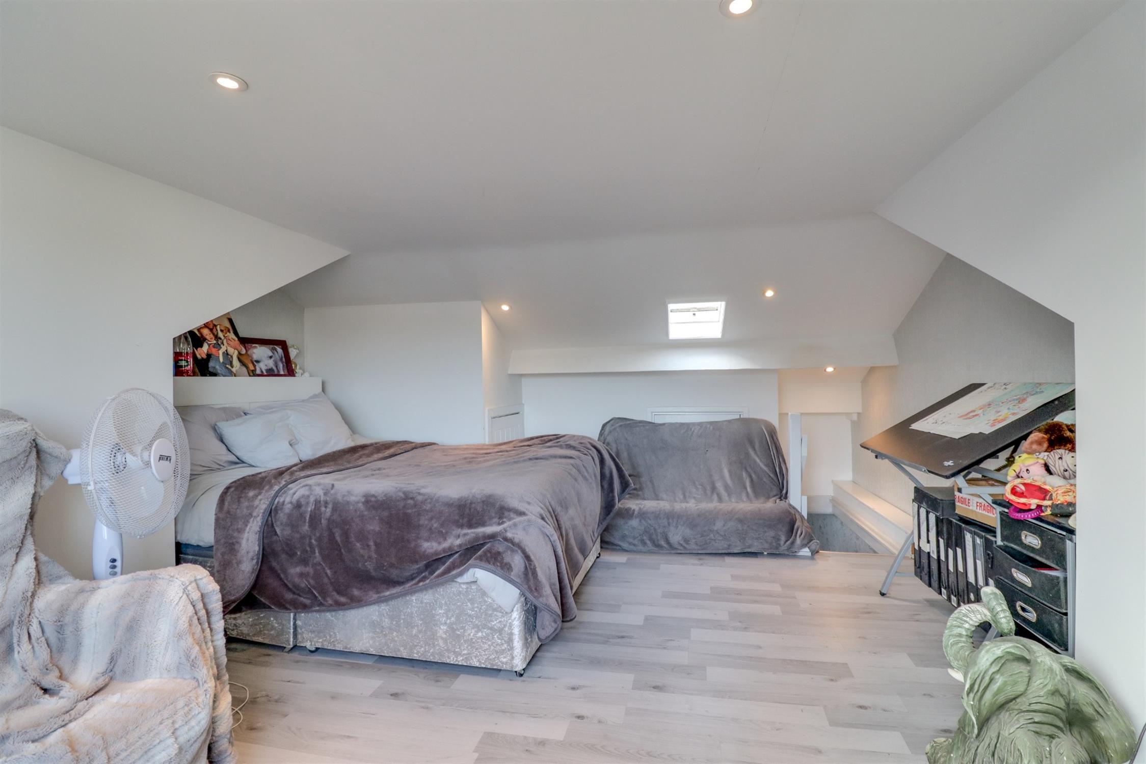Smooth finish to ceiling with inset spotlights, skylight, double glazed window to rear elevation, eaves storage, laminate flooring.