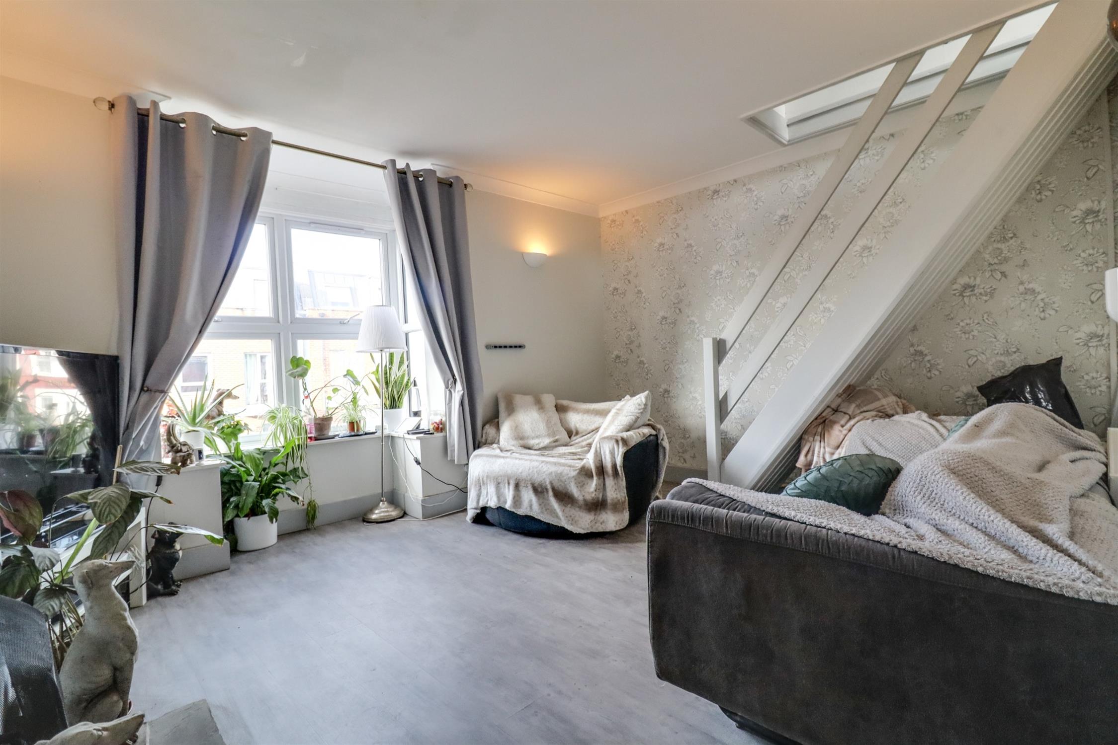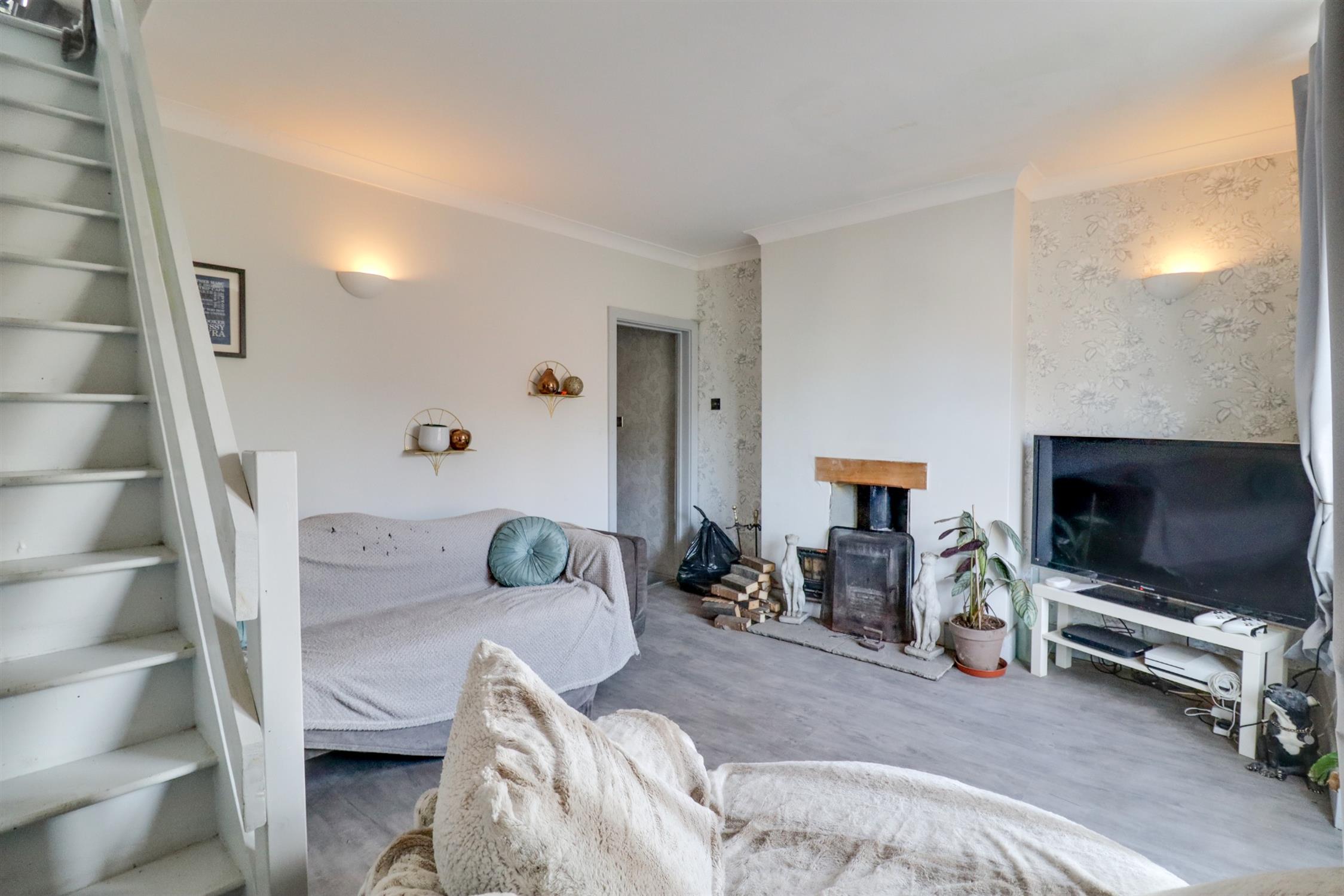 Smooth finish to coved ceiling, double glazed bay window to front elevation, log burner, stairs rising to loft room, radiator, laminate flooring.