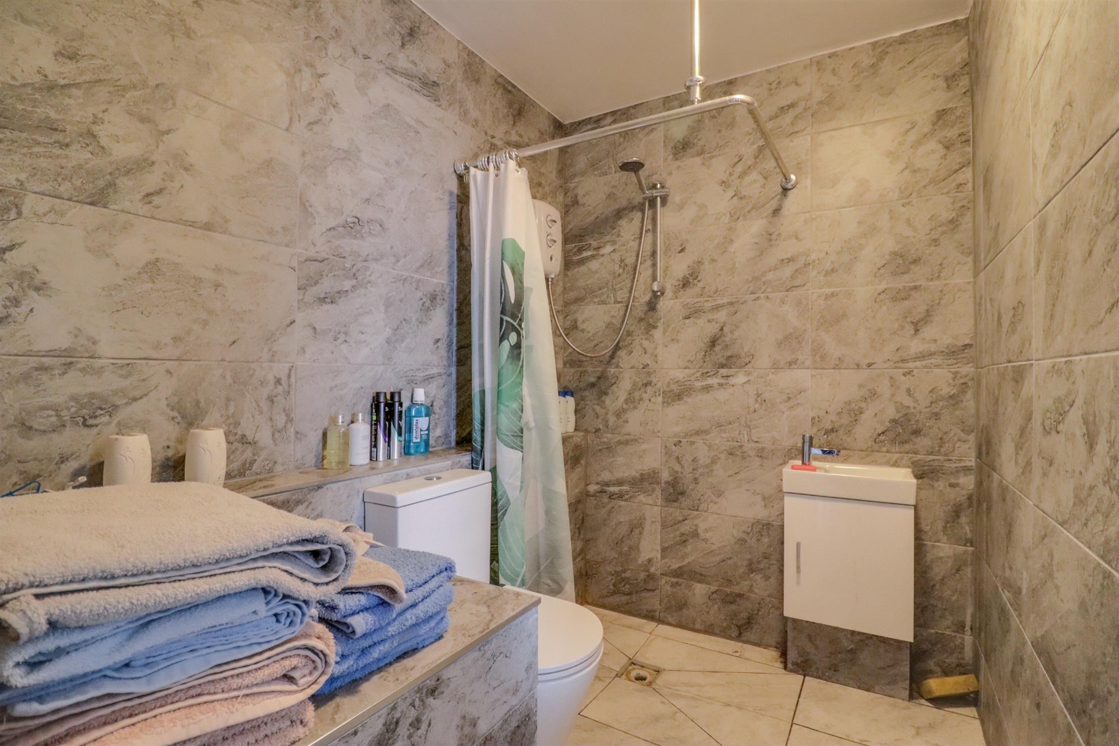 Smooth finish to ceiling, wet room shower, low level WC, vanity wash hand basin, fully tiled walls and flooring.