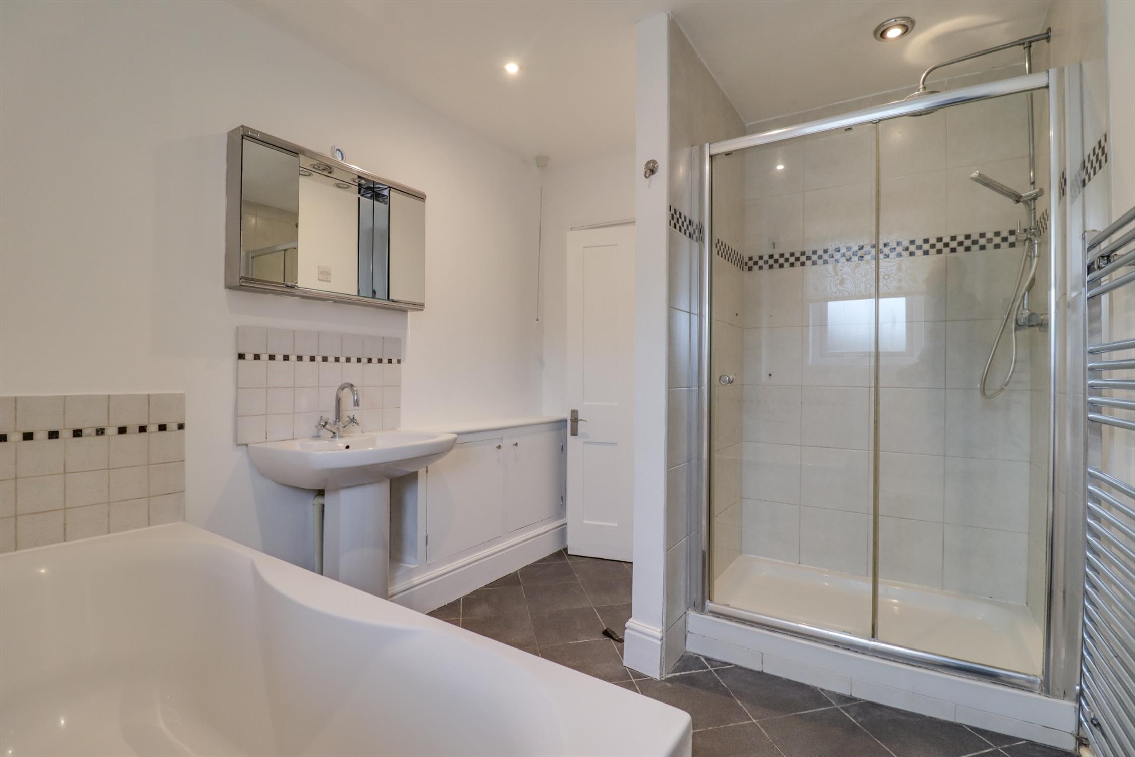 Smooth finish to ceiling with inset spotlights, double glazed window to rear elevation, panel enclosed bath with centralised taps, low level WC, wash hand basin, walk in shower cubicle, heated ladder towel rail, tiling to principle areas and flooring.