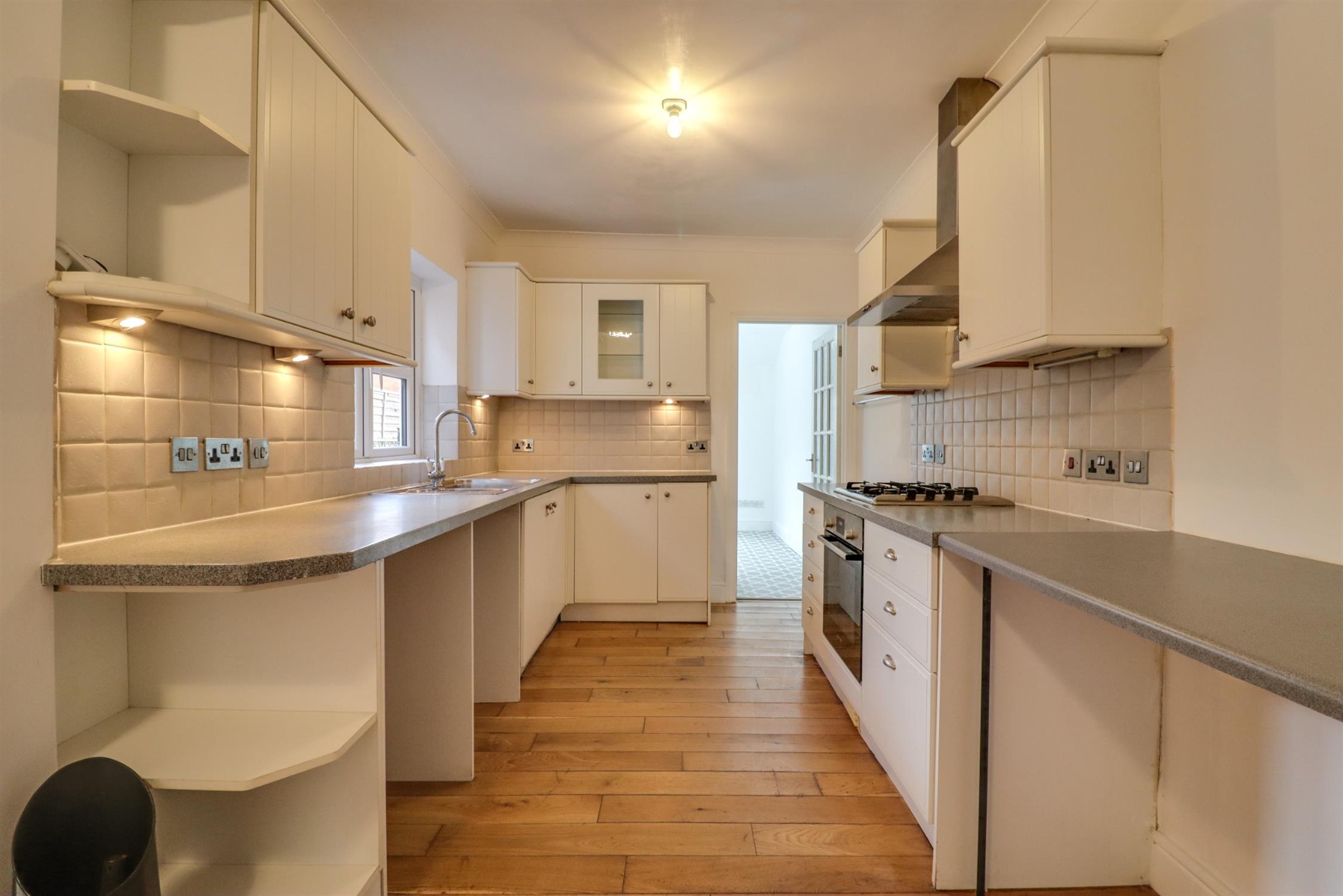 Smooth finish to coved ceiling, double glazed door to rear elevation, double glazed window to side elevation, feature fireplace, under stair storage, range of matching wall base and drawer units with roll top work surface over, stainless steel sink and drainer inset, integrated oven with gas hob and extractor fan over, space for appliances, breakfast bar, tiled splashbacks, radiator, wooden flooring.