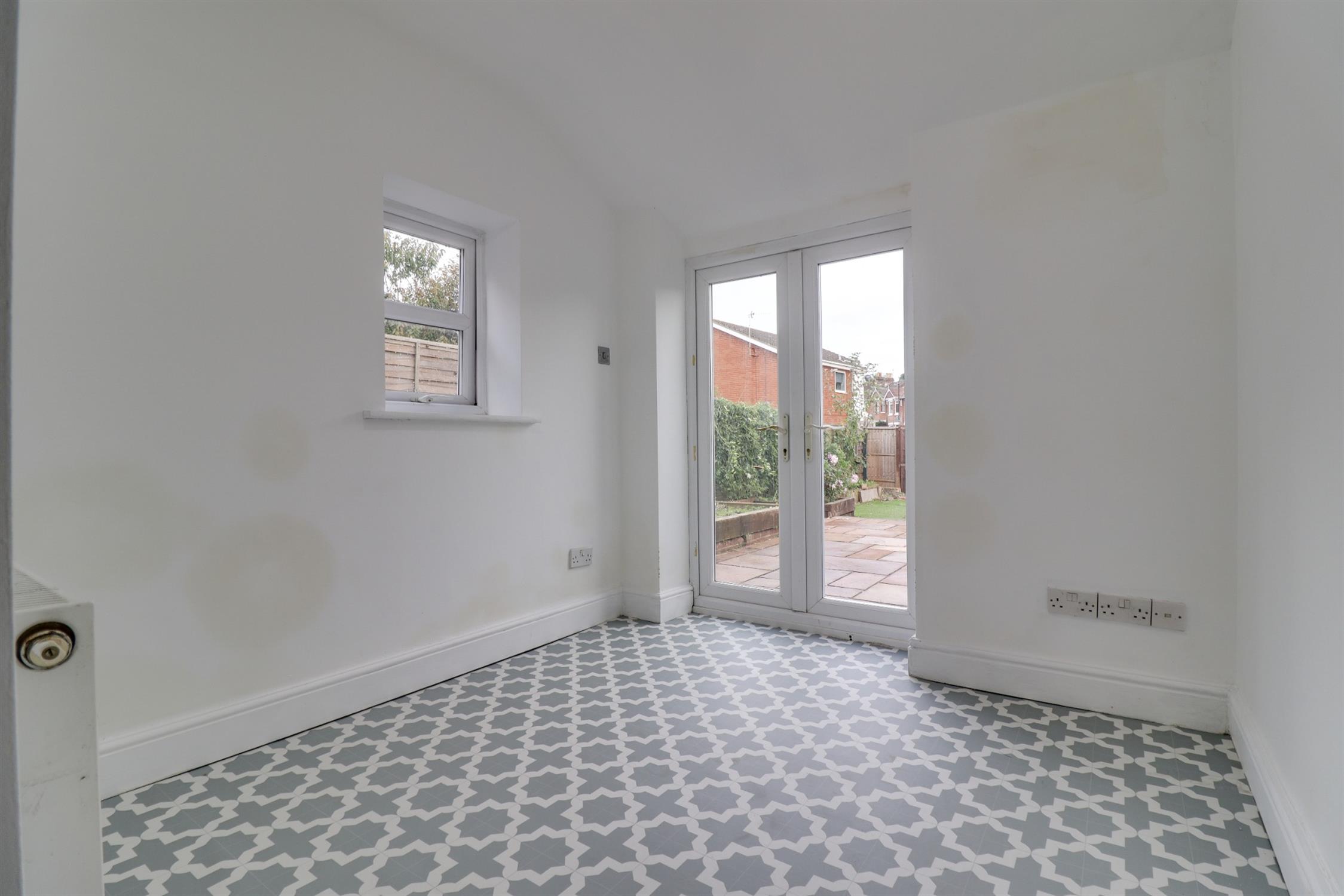 Smooth finish to ceiling, double glazed French doors to rear elevation, double glazed window to side elevation, radiator.