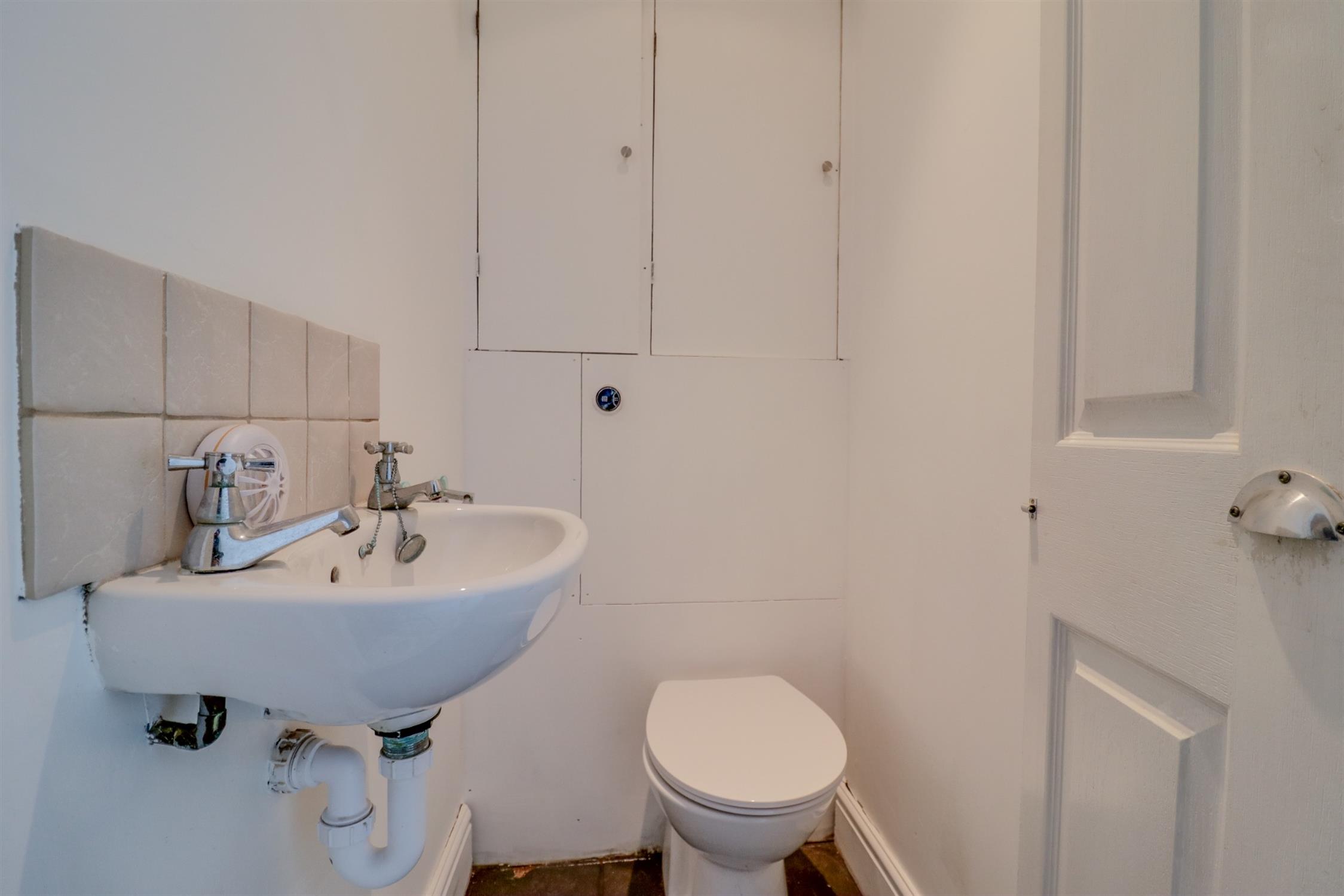Smooth finish to ceiling with inset spotlights, low level WC and wash hand basin, cupboard housing boiler, tiled splashback.