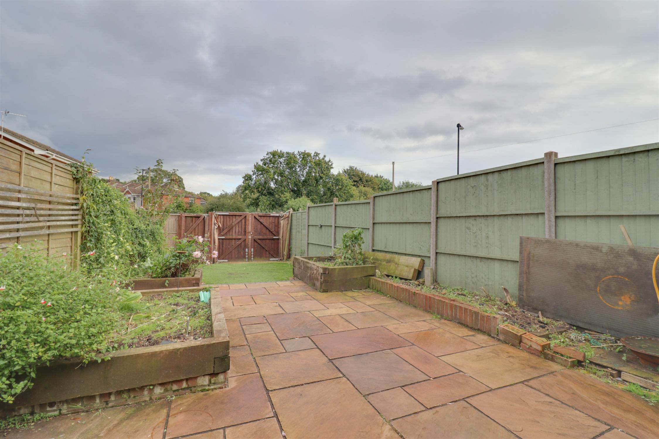 Fence enclosed rear garden, large patio seating area leading to artificial lawn, raised flower bed borders, gated rear access.