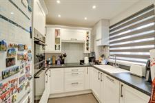 Smooth finish to ceiling with inset spotlights, double glazed window to front elevation, range of matching wall base and drawer units with roll top work surface over, sink and drainer inset, integrated oven and hob with extractor fan over, integrated dishwasher and washing machine, space for fridge freezer, wall mounted combi boiler.