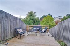 Fence enclosed rear garden, patio seating area leading to raised decked area, steps leading to storage shed.