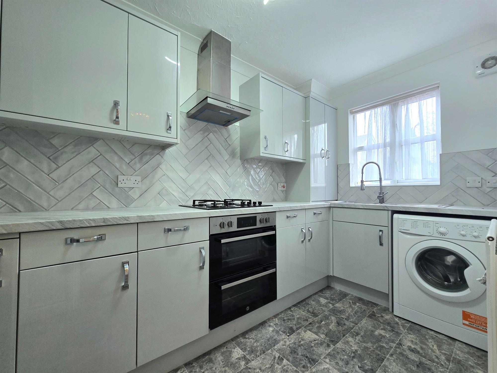 KITCHEN – A modern fitted kitchen featuring high-gloss grey wall and base units, an undercounter washing machine, gas hob, electric oven, and space for a freestanding fridge/freezer.