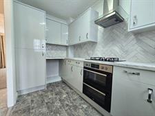 KITCHEN – A modern fitted kitchen featuring high-gloss grey wall and base units, an undercounter washing machine, gas hob, electric oven, and space for a freestanding fridge/freezer.