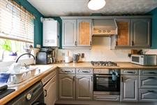 Textured finish to ceiling, double glazed window to front elevation, range of matching wall base and drawer units with roll top work surface over, bowl and a half sink and drainer inset, integrated oven and hob with extractor, wall mounted combi boiler, space for appliances.