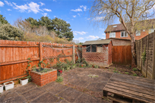 Fence enclosed rear garden, low maintenance patio with raised flower beds, shed.