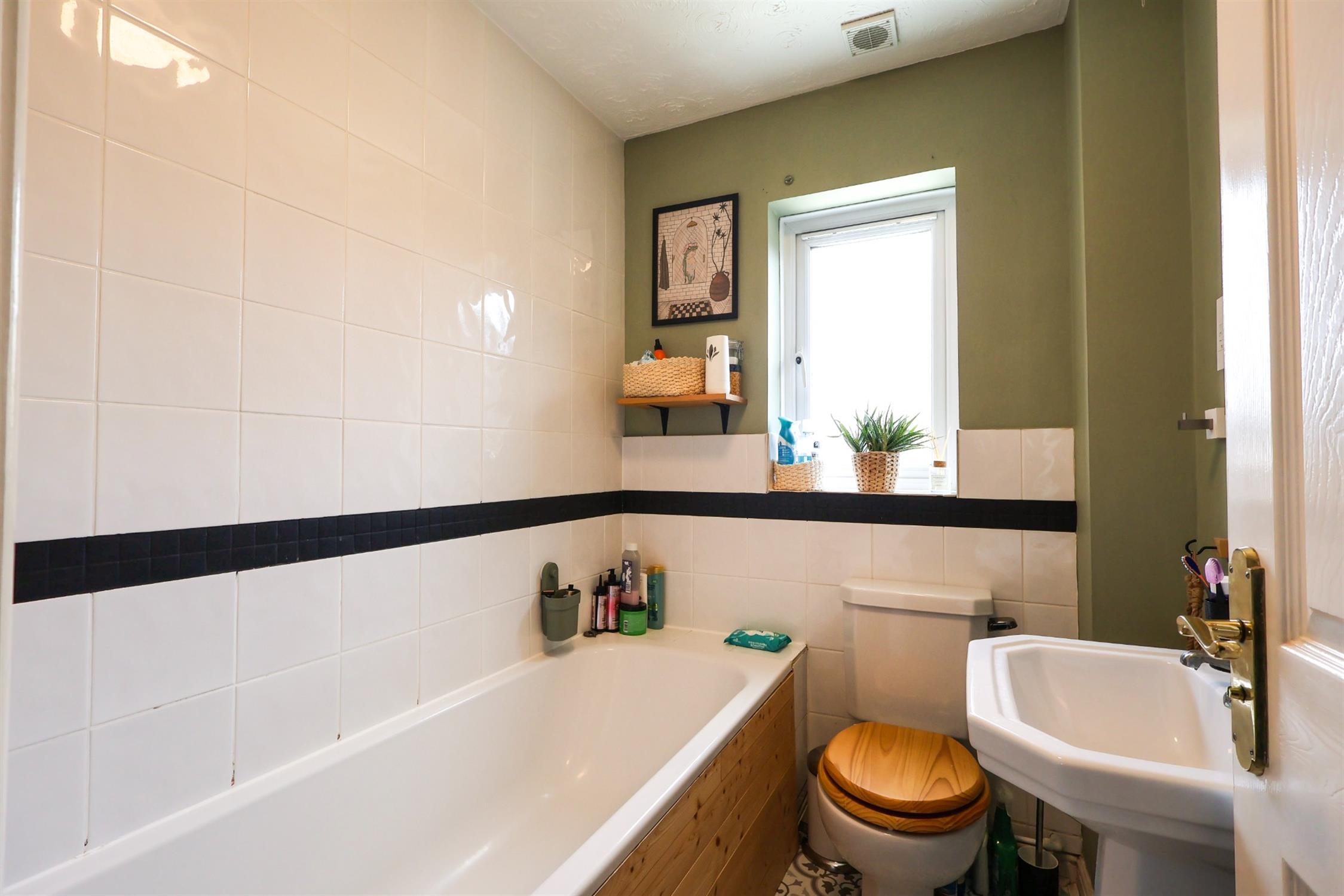 Textured finish to ceiling, double glazed window to rear elevation, panel enclosed bath with shower attachment over, low level WC, wash hand basin, tiling to applicable areas.