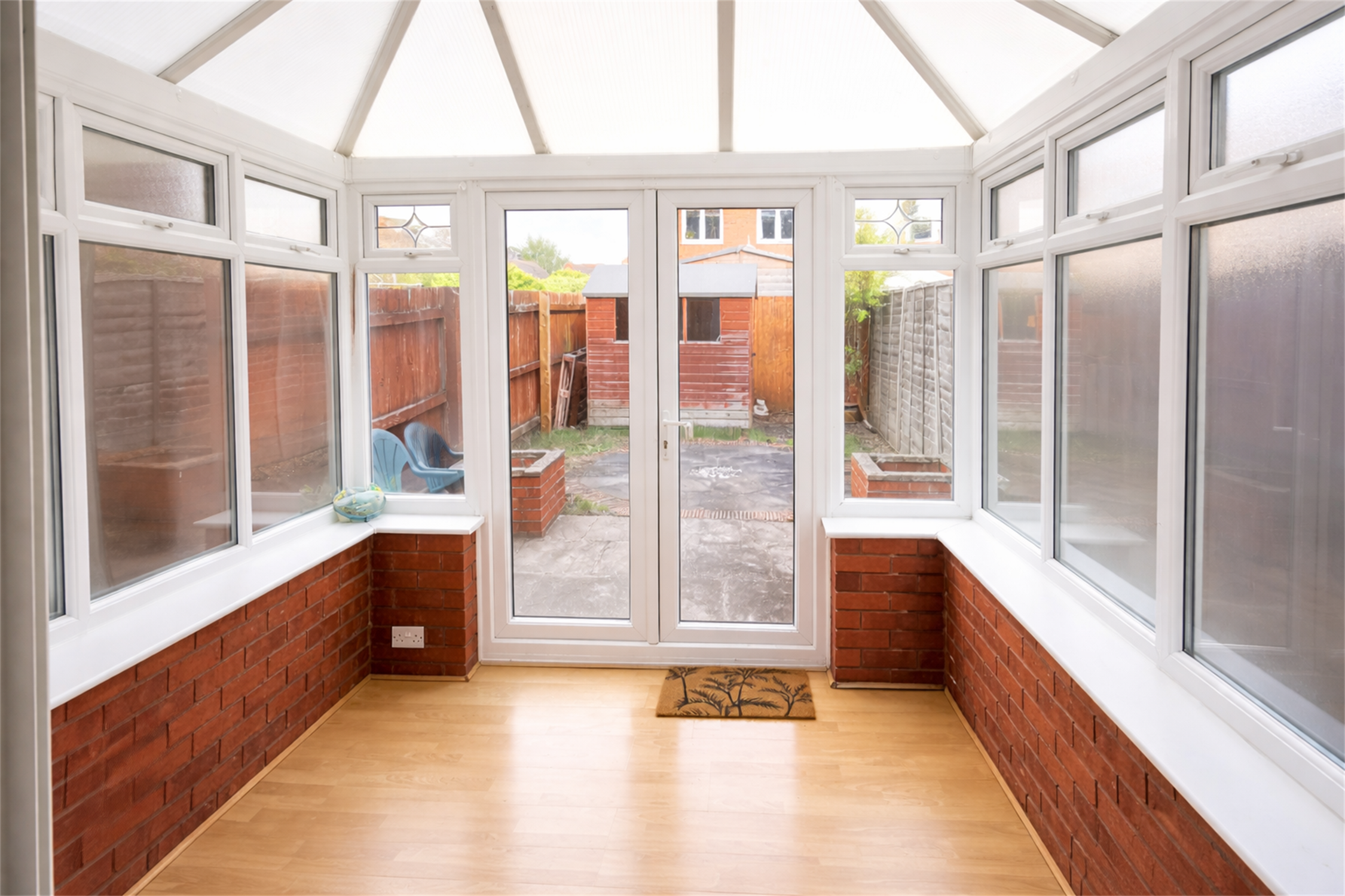 Polycarbonate roof, double glazed windows to rear and side elevation, double glazed French doors to rear elevation, laminate flooring.