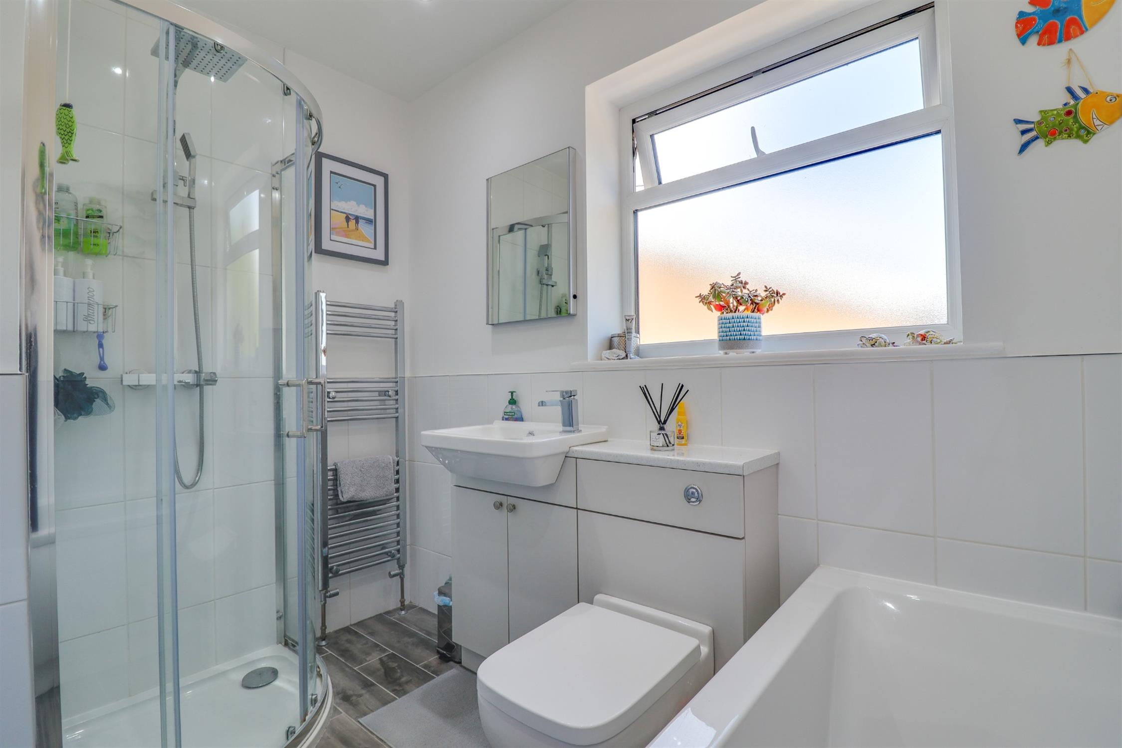 Smooth finish to ceiling with inset spotlights, double glazed window to side elevation, four piece suite comprising of panel enclosed bath, vanity wash hand basin and low level WC and corner shower cubicle with mains fed shower over, heated ladder towel rail, tiling to applicable areas.