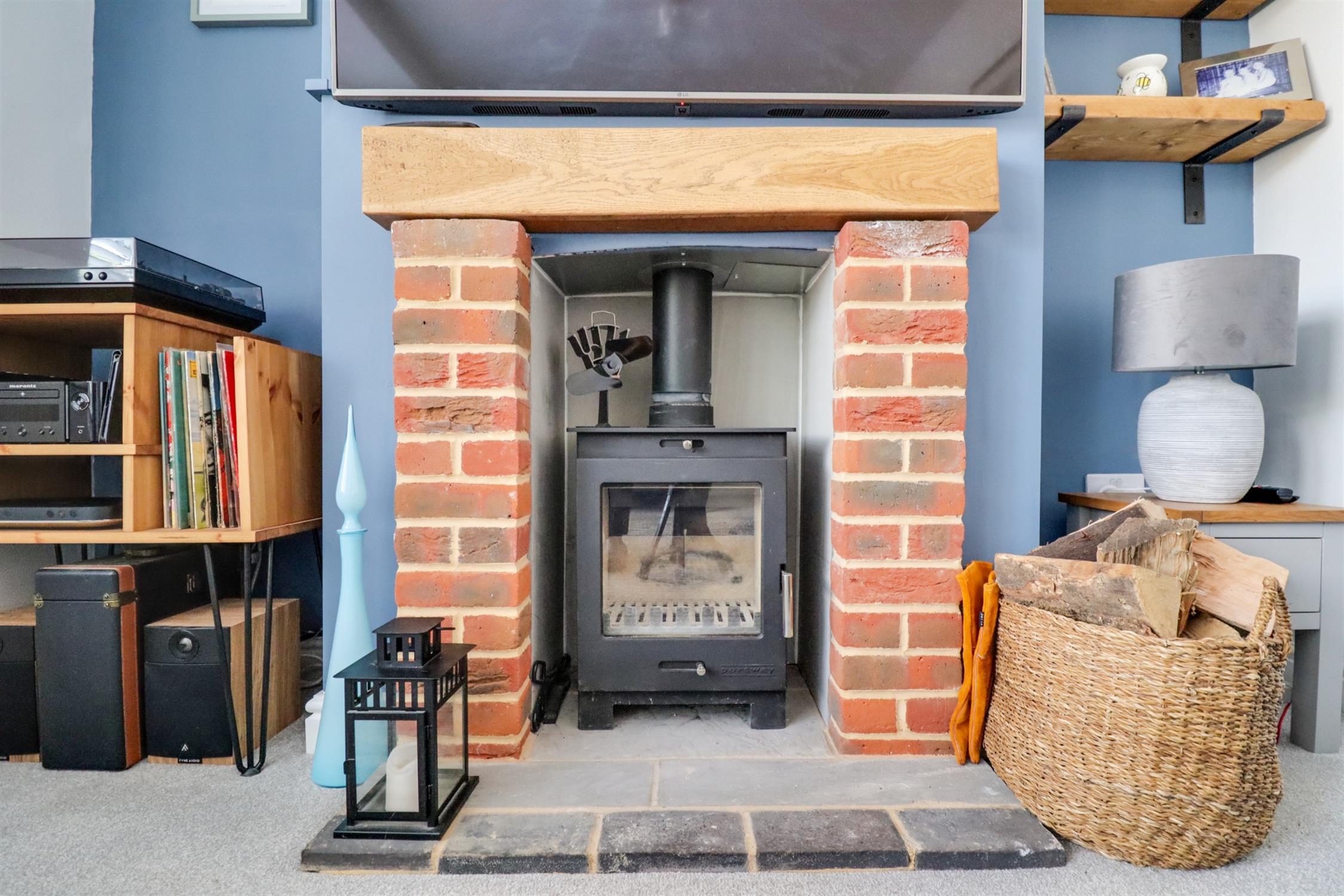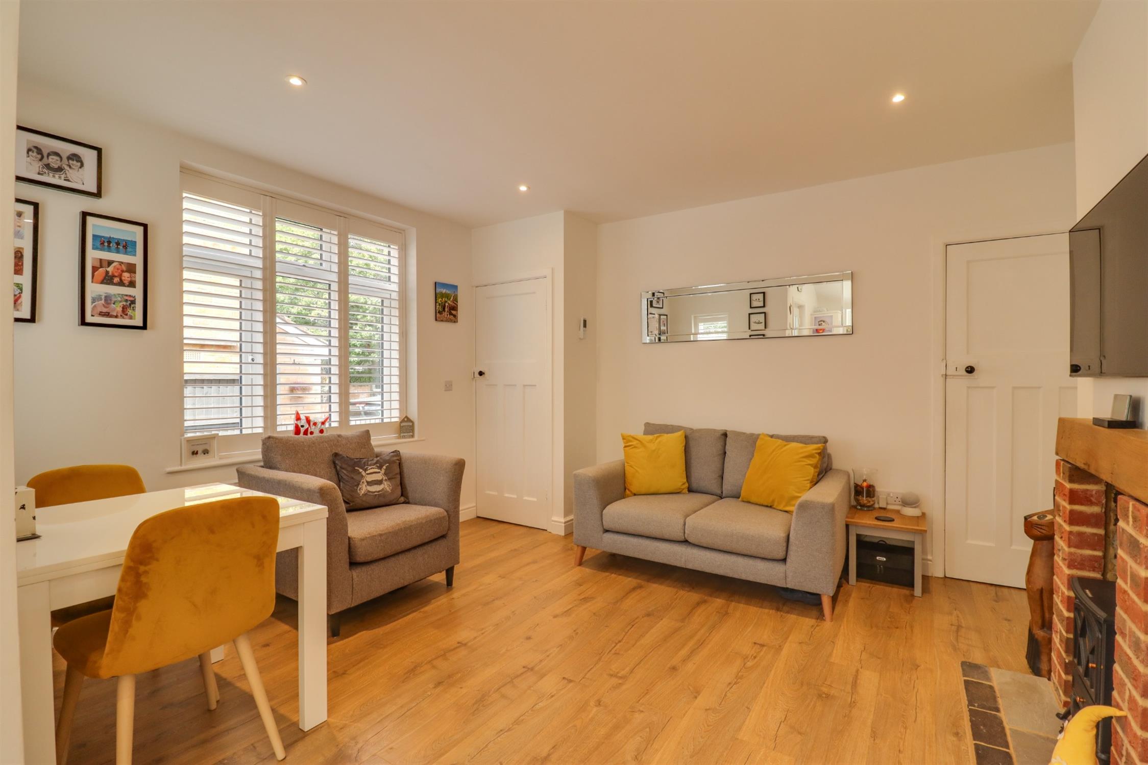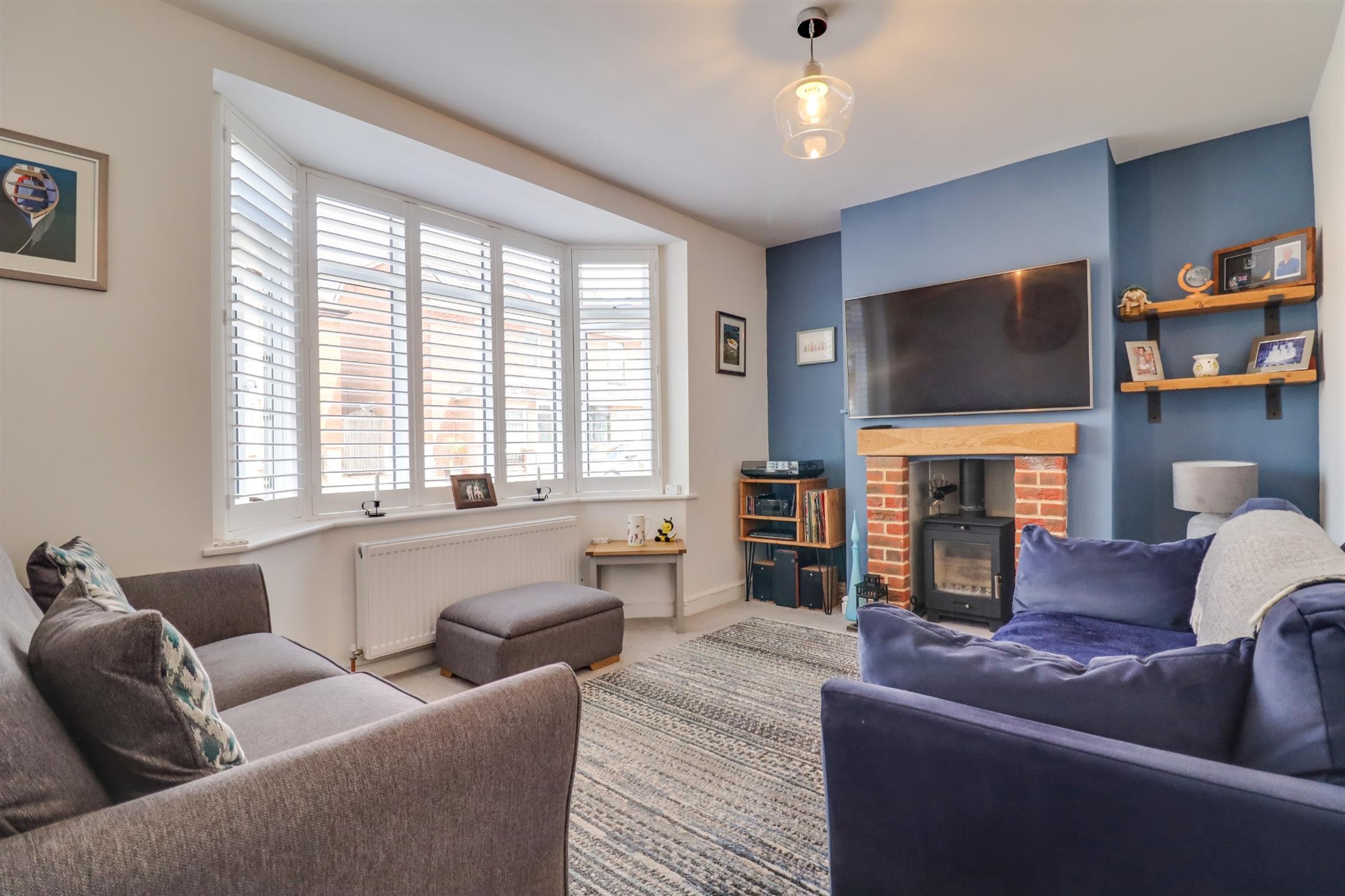Smooth finish to ceiling, double glazed bay window to front elevation with fitted shutters, log burner, radiator.