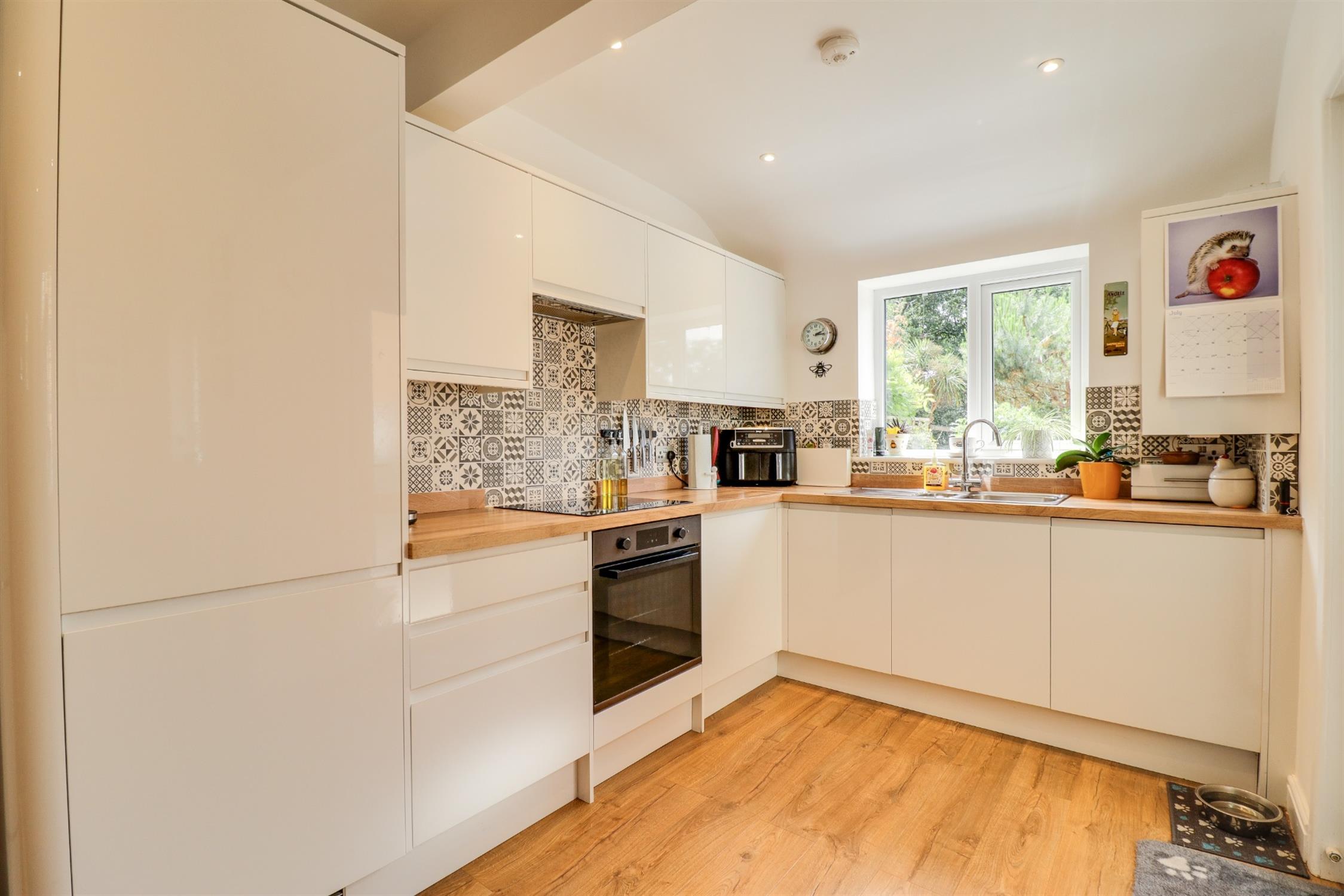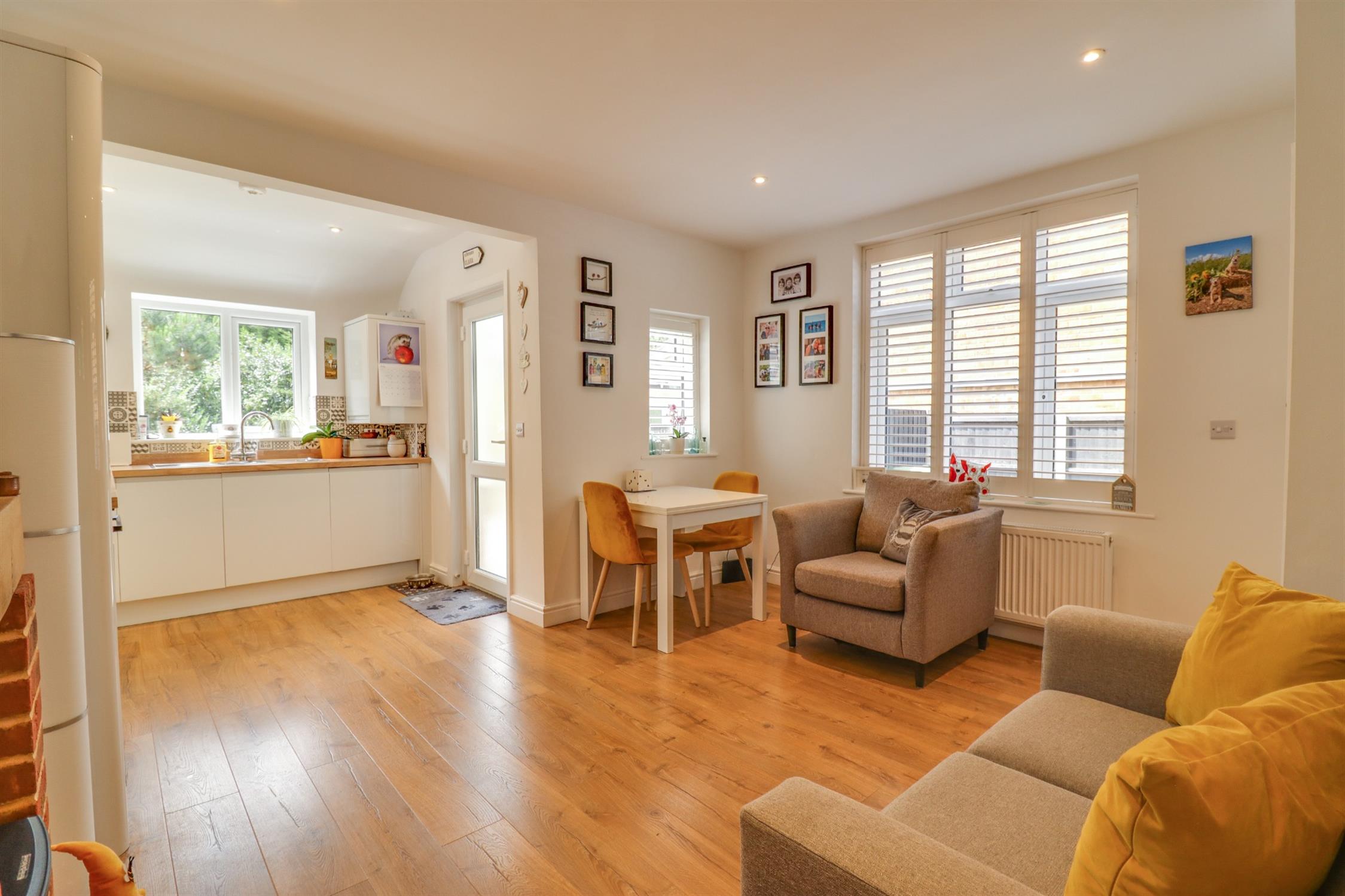 Smooth finish to ceiling with inset spotlights, double glazed windows to side and rear elevation with fitted shutter blinds, double glazed door to side elevation, feature fireplace, under stairs storage cupboard, radiator, range of modern wall base and drawer units with roll top work surface over, stainless steel sink and drainer inset, integrated oven with hob and extractor fan over, integrated fridge freezer, dishwasher and washing machine, tiled splashbacks, wooden flooring.