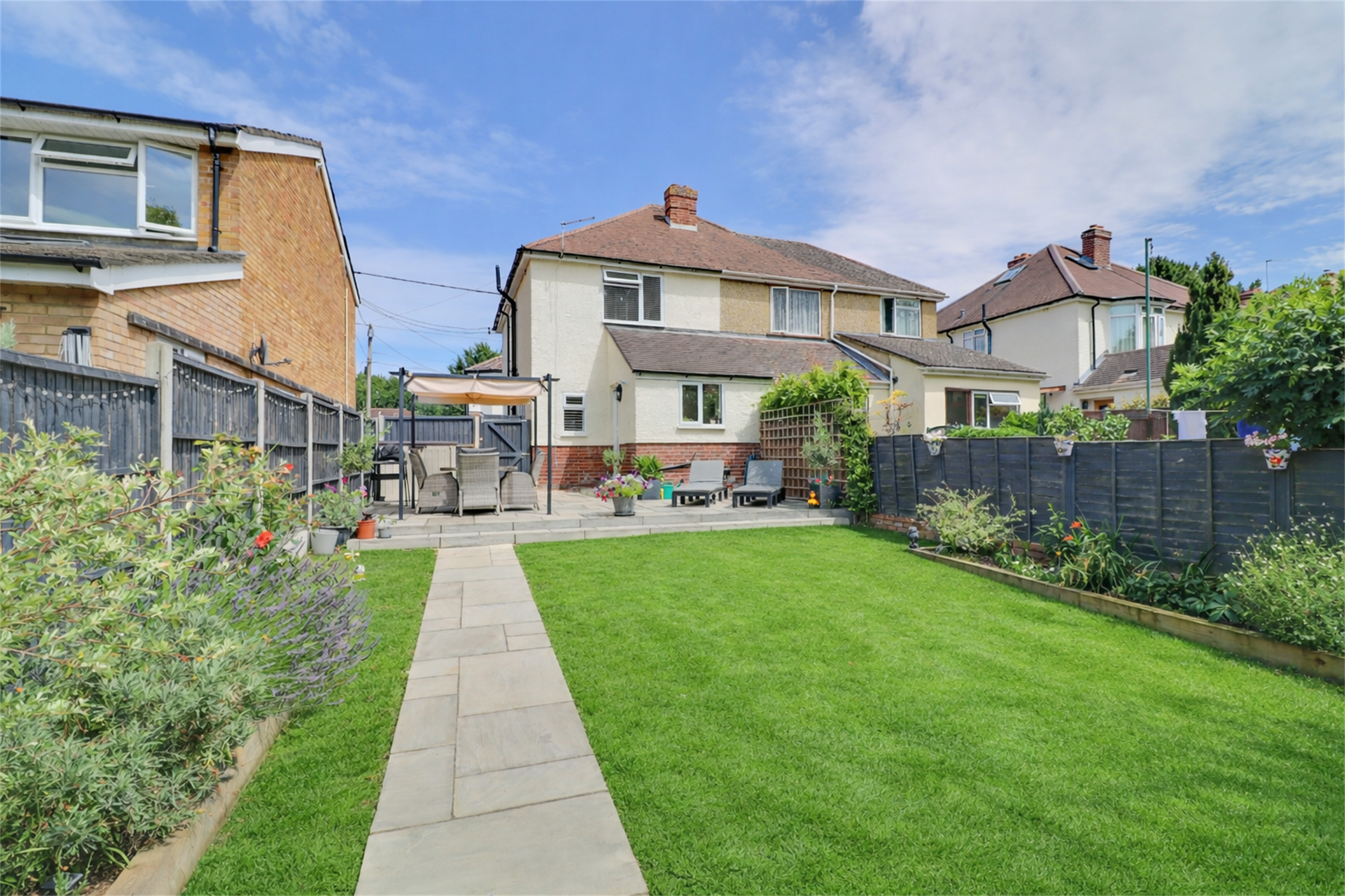 Dropped kerb leading to driveway parking for multiple vehicles, gated side access into rear garden, step to front door.