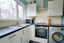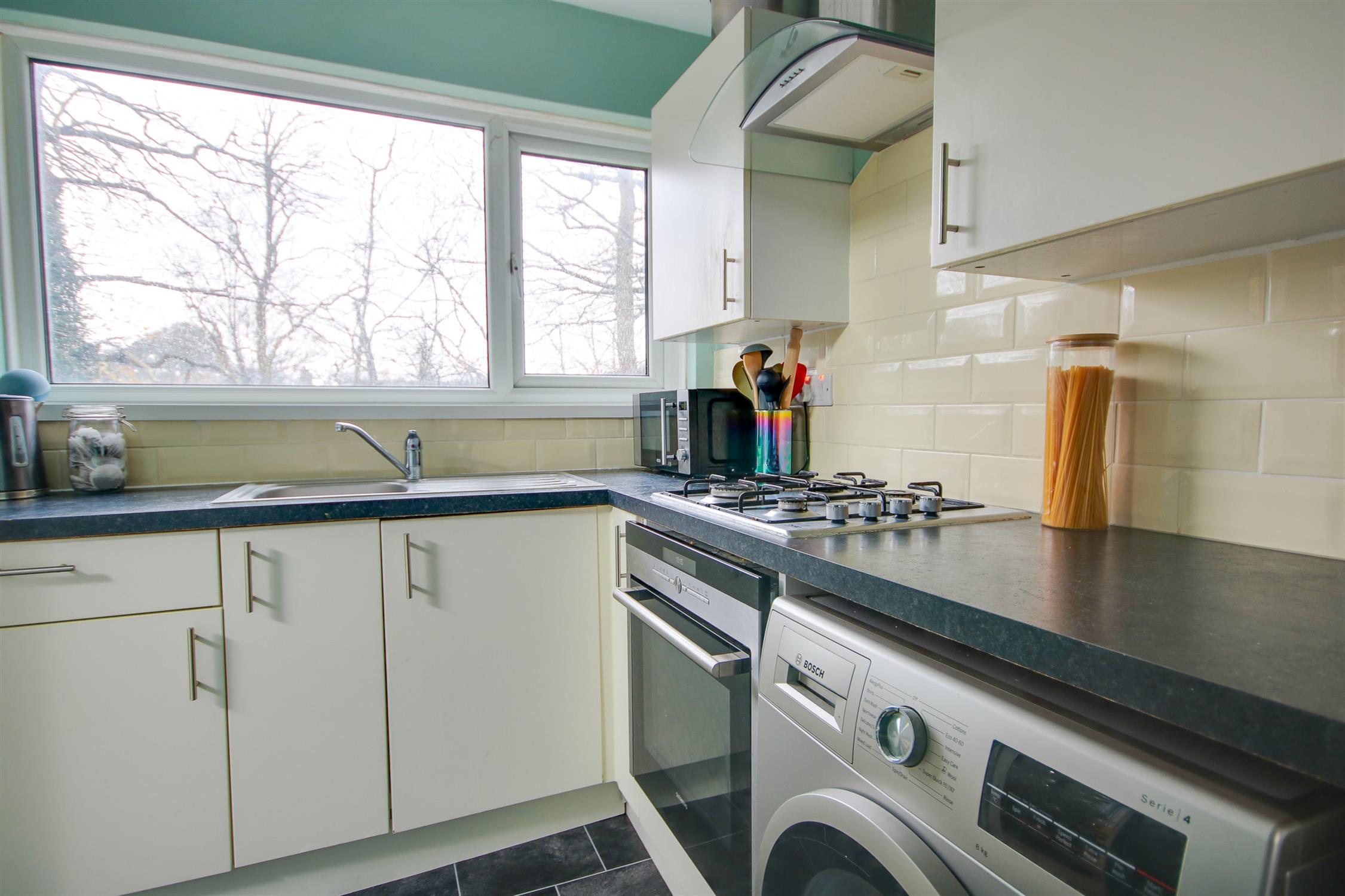 Smooth ceiling, UPVC double glazed window to rear, a range of wall, base and drawer units with work surface over, built-in electric oven and four-ring gas hob with extractor over, tiled splashbacks, space and plumbing for washing machine, space for fridge/freezer, tiled floor.