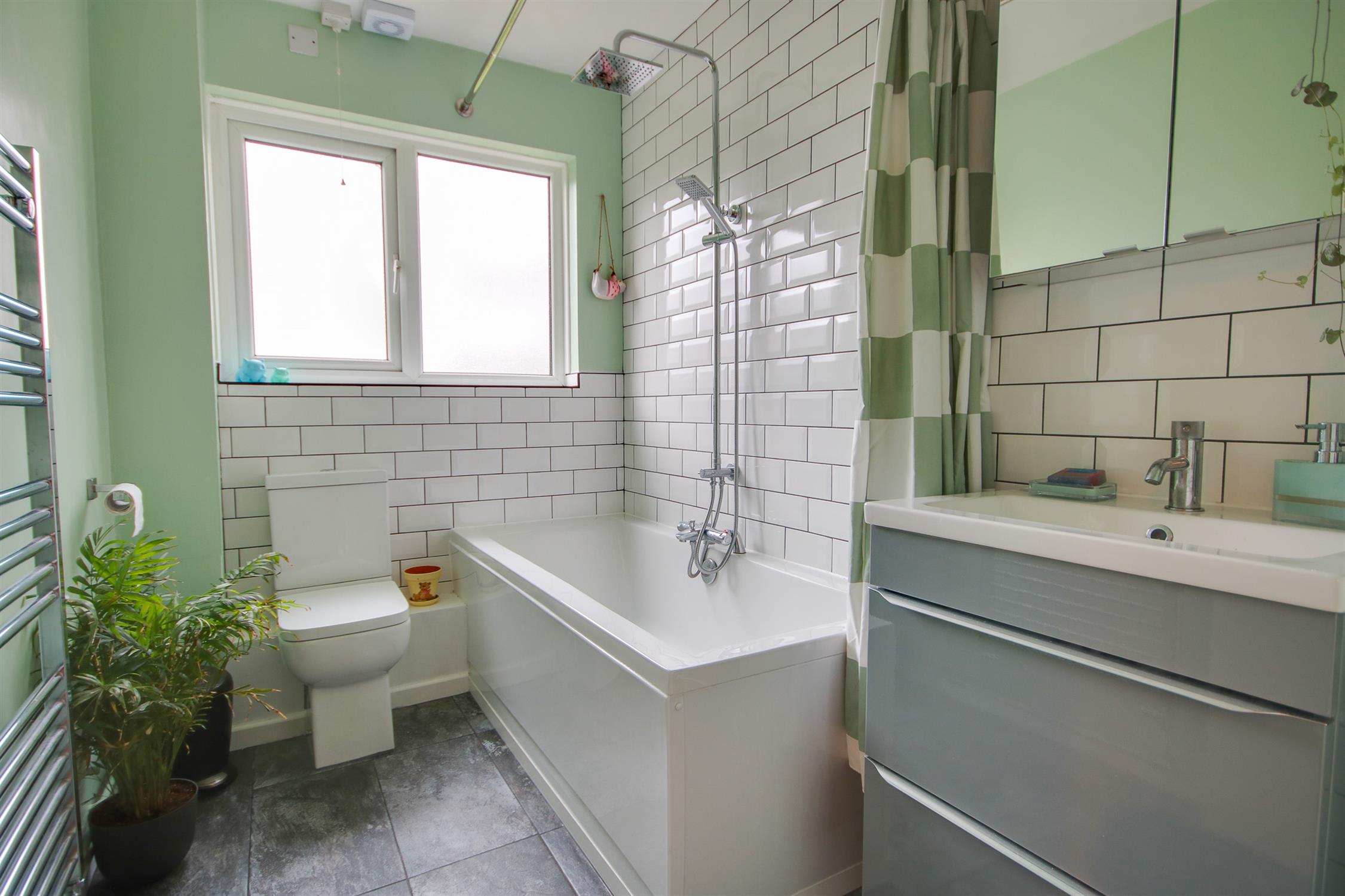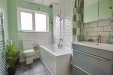 Smooth ceiling with extractor over, UPVC double glazed obscured window to side, three-piece suite comprising: panel enclosed bath with mains fed shower over, WC, wash hand basin and heated ladder towel rail, tiling to principal areas, tiled floor.