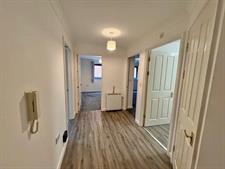 Storage heater, built in cupboard, coving and smooth finish to ceiling with smoke alarm, wall mounted intercom system, doors to lounge, bedroom one, bedroom two and bathroom.