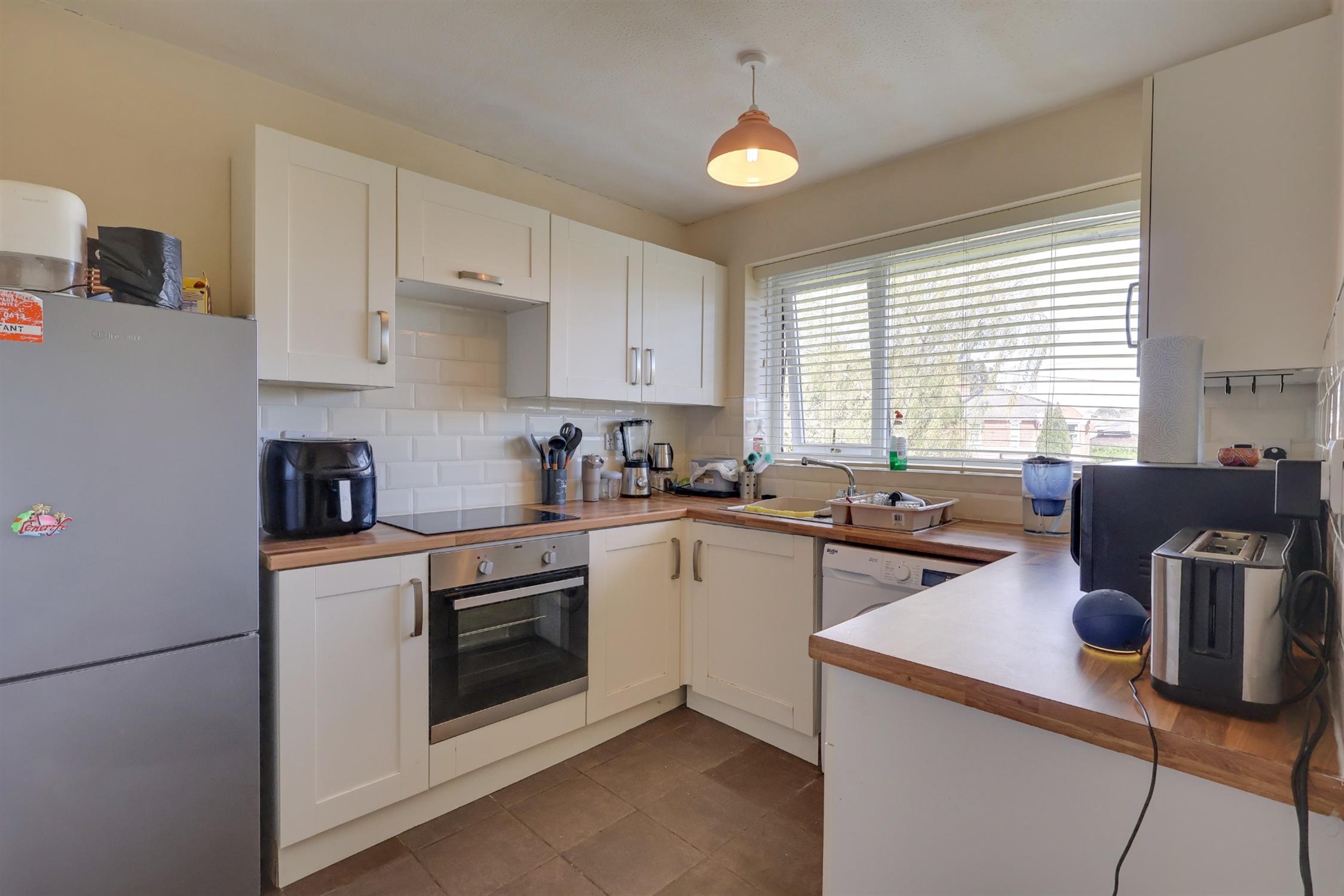 Textured finish to ceiling, double glazed window to rear elevation, matching wall base and drawer units with roll top work surface over, stainless steel sink and drainer inset, integrated oven and hob, space for fridge/freezer and washing machine, tiled splashbacks and flooring.