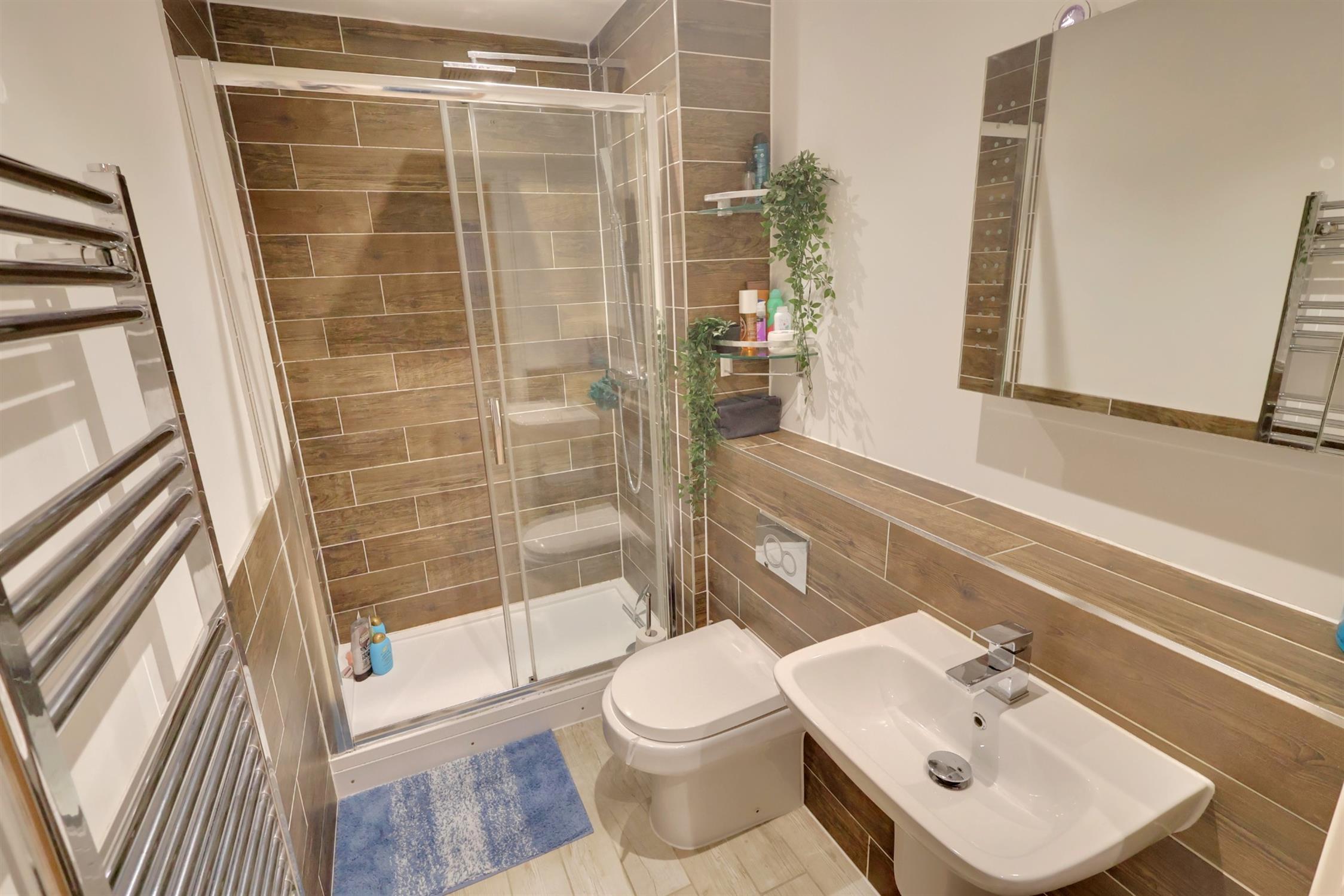 The modern shower room is finished to a high standard and includes a walk-in shower, WC, hand basin and heated/electric towel radiator, all presented in a sleek, contemporary style.