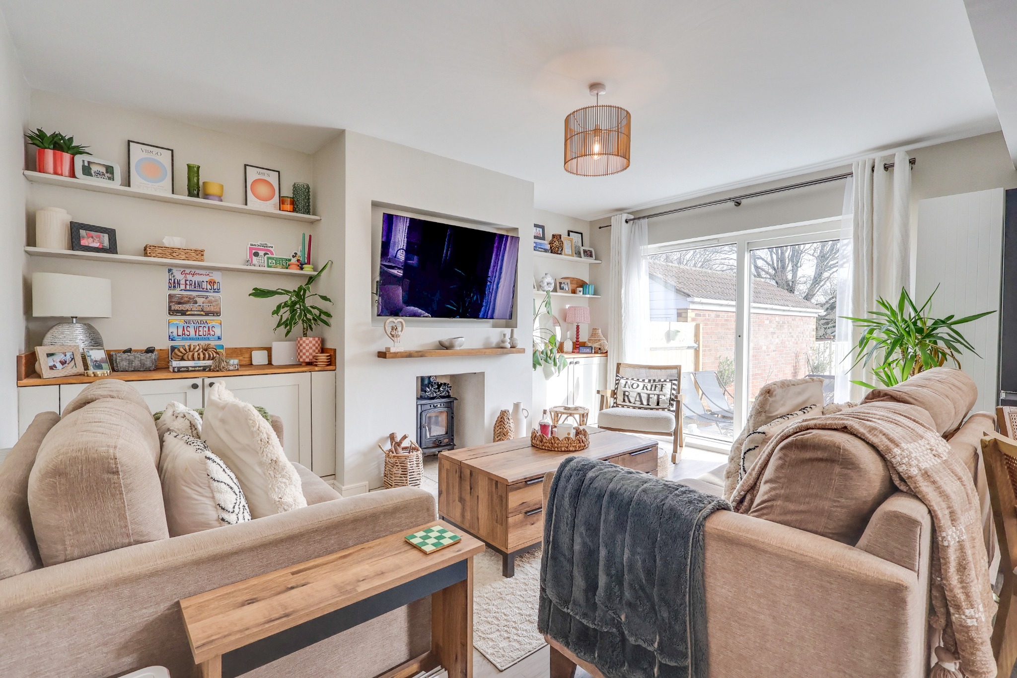 Smooth ceiling with inset spotlights, UPVC double glazed window to rear, UPVC double glazed door to rear and UPVC double glazed patio doors to rear, contrasting shaker-style wall, base and drawer units with work surface over, sink inset, integrated dishwasher, built-in oven, gas hob with extractor over, space for fridge/freezer, large pantry cupboard, space for wood burner, bespoke storage cupboards either side of chimney breast, radiator.